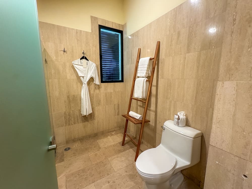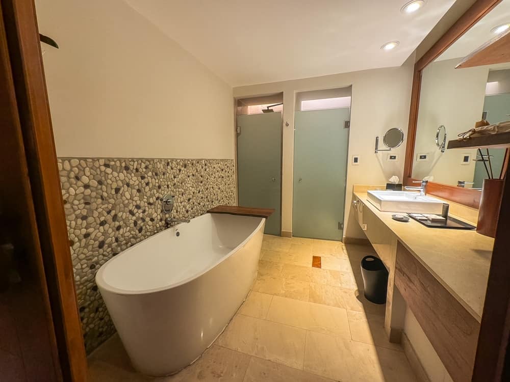 Comparativement à notre suite, la chambre est un peu plus petite, mais était confortable. Elle dispose d’un coin salon et contrairement à la suite, nous avions une douche et une baignoire.