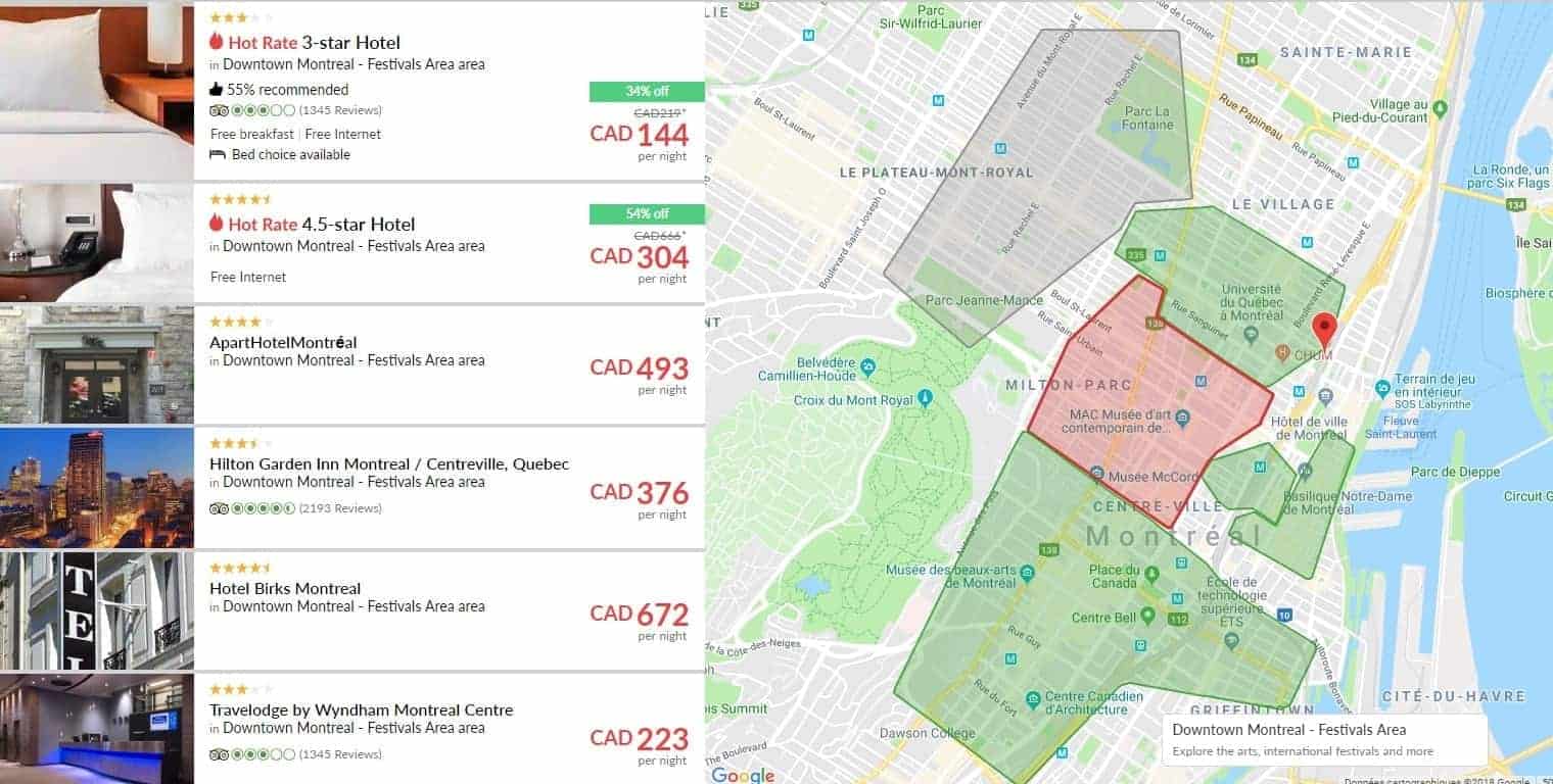 Sur l’exemple ci-dessous pour une recherche sur Montréal, vous pouvez voir que la ville est divisée en différents quartiers: