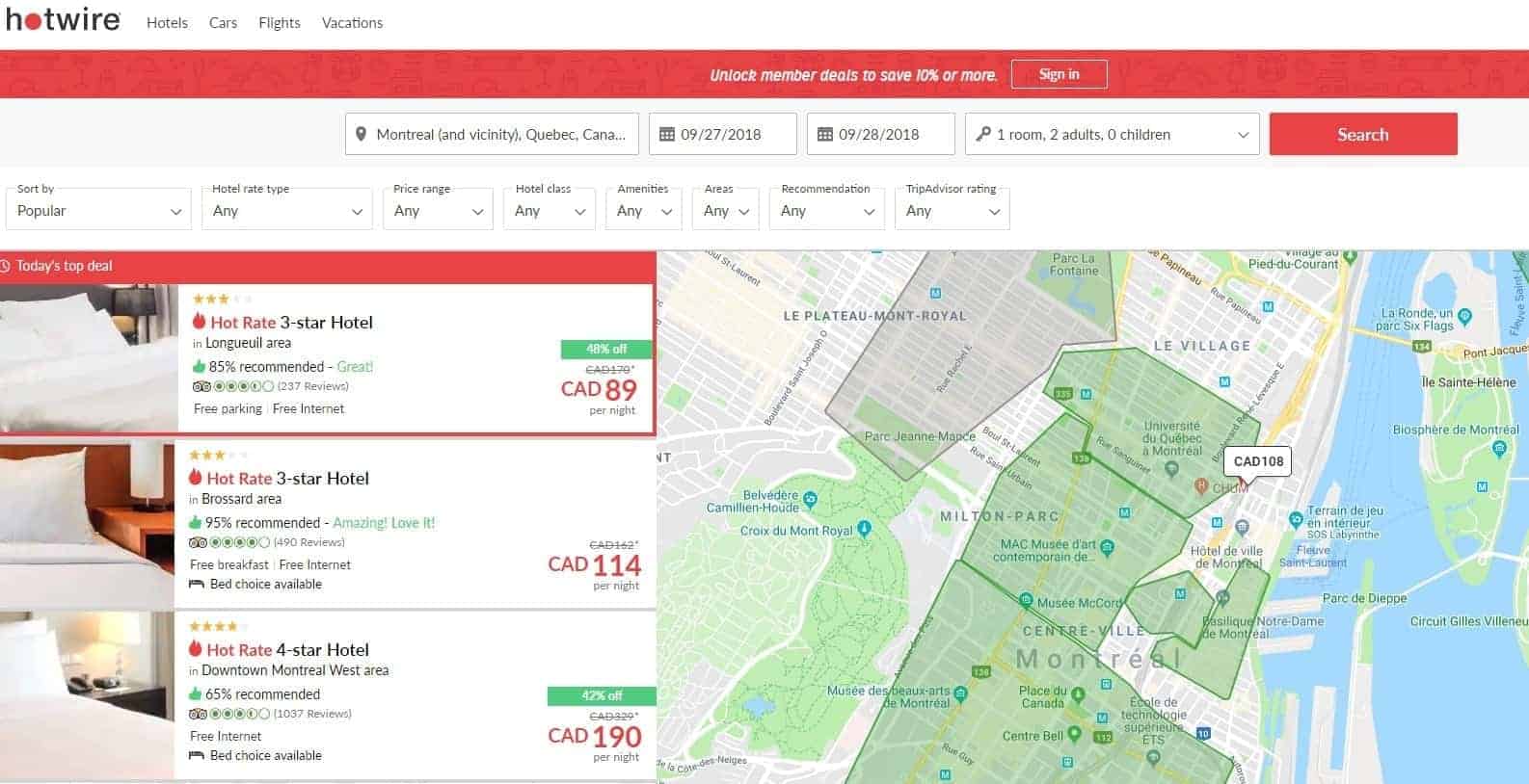Les prix n’avaient pas vraiment évolué du côté des plateformes traditionnelles. Je fais donc un tour sur Hotwire.com: