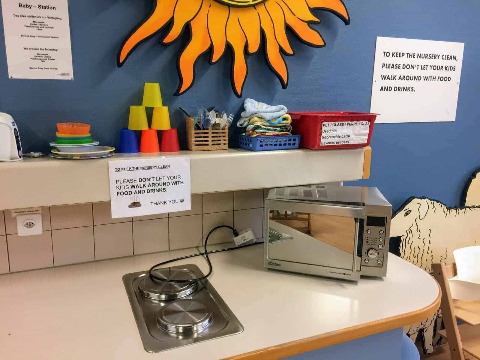 Également, un micro-ondes et des plaques chauffantes aident à la préparation des repas. Il y a également de nombreux ustensiles de cuisines et un chauffe-biberon.