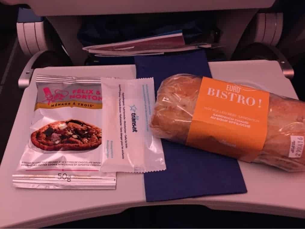 Le repas est servi 1h30 après le décollage après un apéritif (payant pour les boissons alcoolisées). La nourriture est vraiment le point faible d’Air Transat. Tout cela ne donne pas très envie. C’est vite digéré: un sandwich et un biscuit!