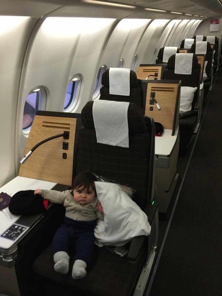 Voyageant avec un bébé et ayant demandé à Swiss un lit bébé, mon siège de ce soir sera donc le 6K. Il a l’avantage d’être individuel, situé sur la droite de l’appareil. Voici donc Alexandra prenant place dans MON fauteuil.