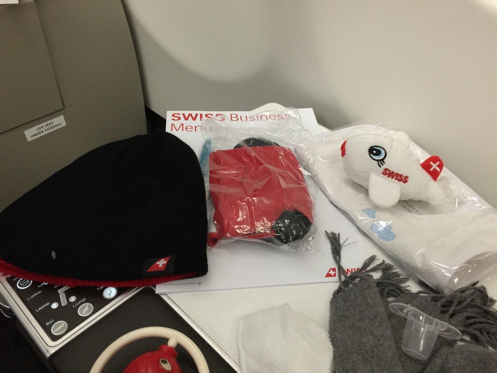Les goodies distribuées sont un bonnet Rouge/noir de Swiss et les habituels bouchons d’oreille, masque de nuit, chaussettes. S’ajoute à cela une peluche pour le bébé 🙂