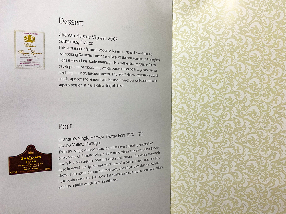 À savoir aussi, chaque bouteille une fois ouverte, est conservée en fin de vol pour les disposer ensuite dans les salons Emirates. Pas de gachis! Ce n’était pas le cas avant il y a encore peu de temps.