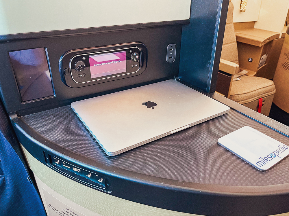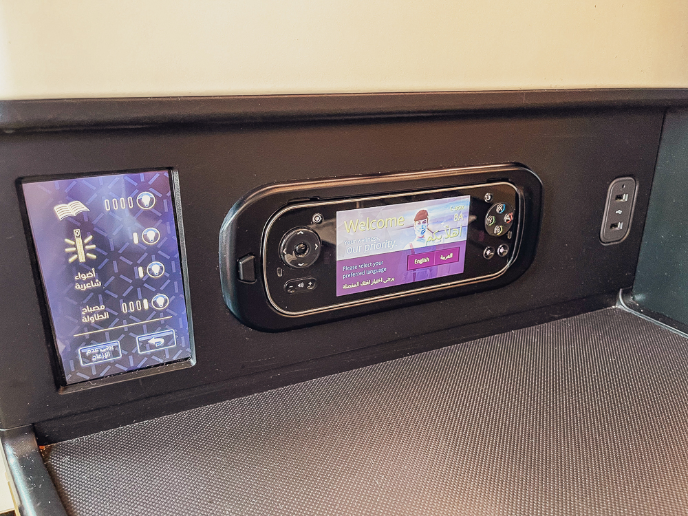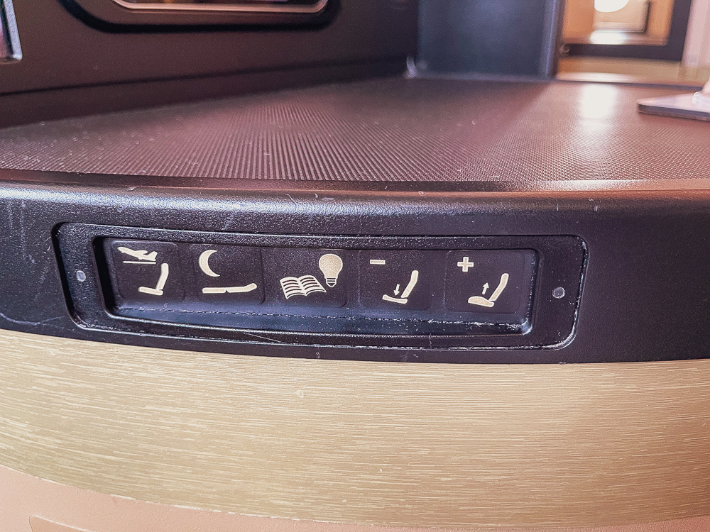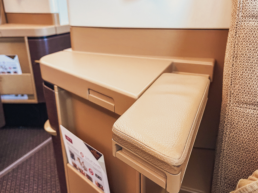 Au niveau du siège, on retrouve une prise USB, une prise électrique, les commandes électriques pour le siège, la télécommande pour la télévision et quelques rangements. La table est de grande taille et il est facile de disposer un ordinateur portable.