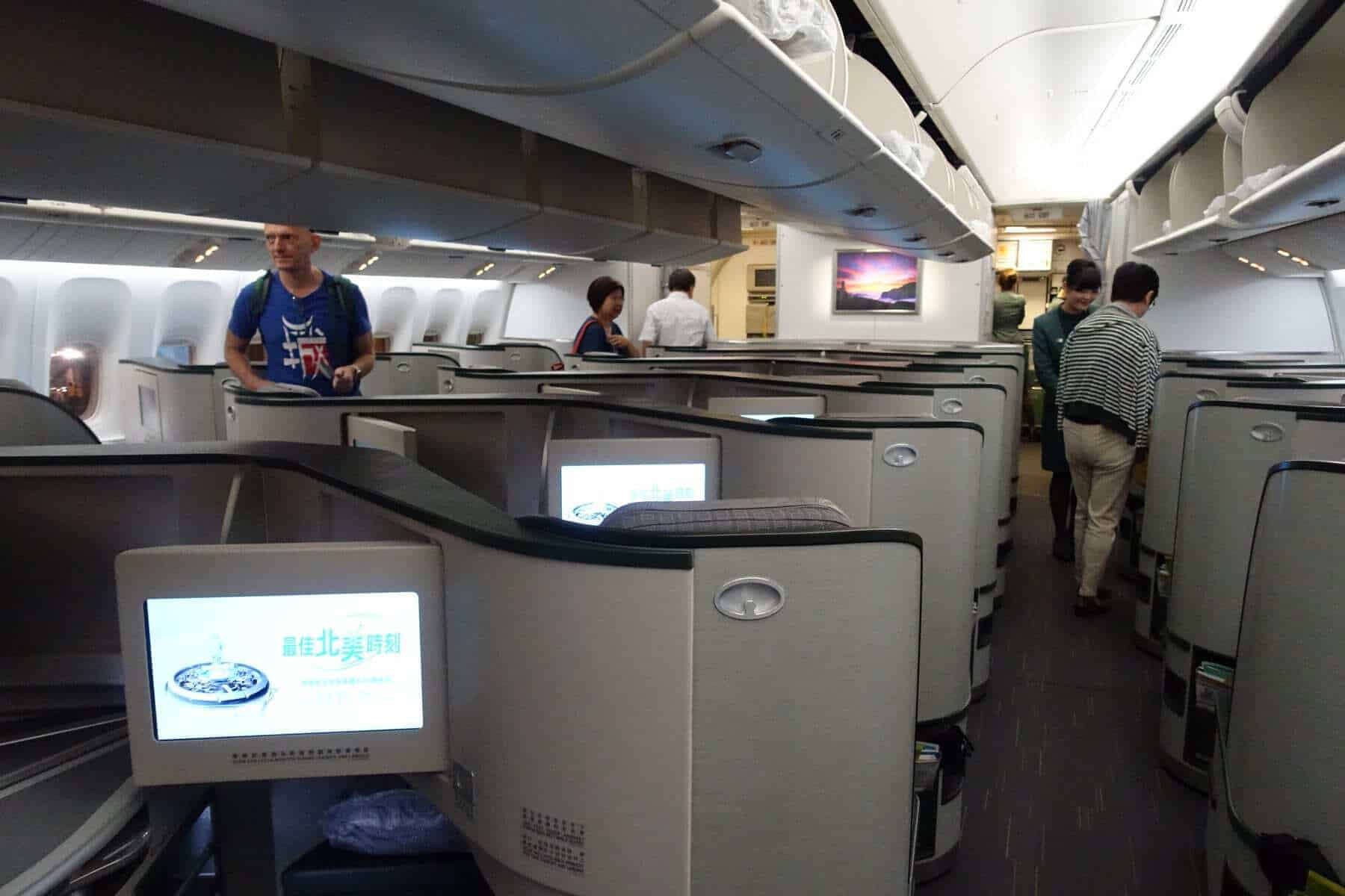 L’embarquement du dernier vol de la soirée se fait en respectant les priorités. La cabine de classe Affaires contient 4 sièges par rangées (1-2-1). Les sièges sont confortables avec assez de rangements et de prises électriques ou USB.