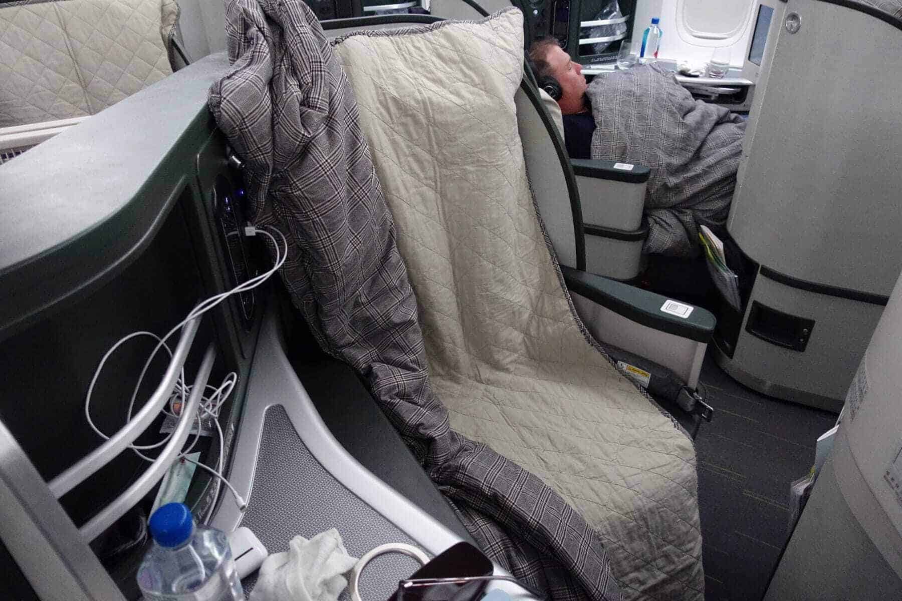Étant un vol de 15 heures, on a bien sûr bien profité du siège pour dormir, pas de matelas, juste une couverture matelassée avec une couette bien confortable.