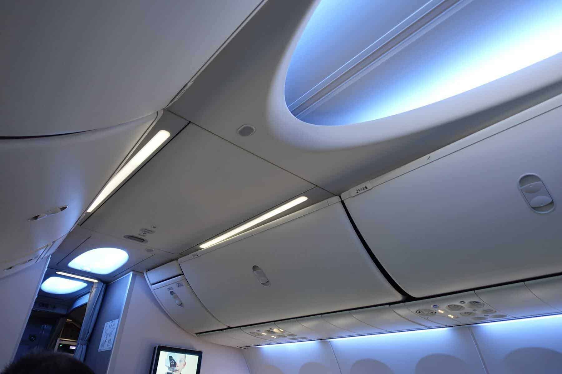 L’éclairage de la cabine s’adapte en fonction de la luminosité extérieure et est très agréable (nous sommes loin des néons d’hôpitaux que nous avions pu observer sur Air Canada Rouge).