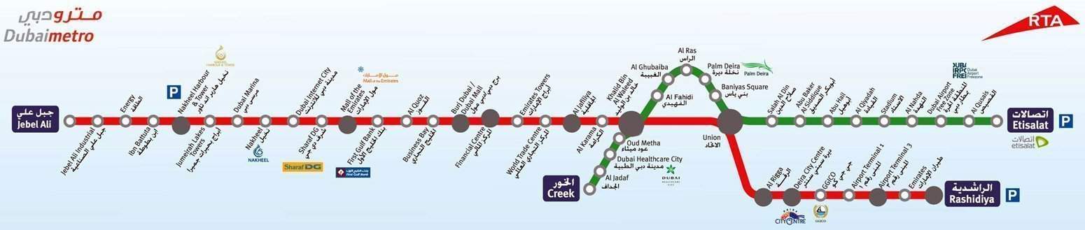 2 metro lines, covering all points of interest in the city, from Etisalat to Creek (green line) and Rashidiya to Jebel Ali (red line).