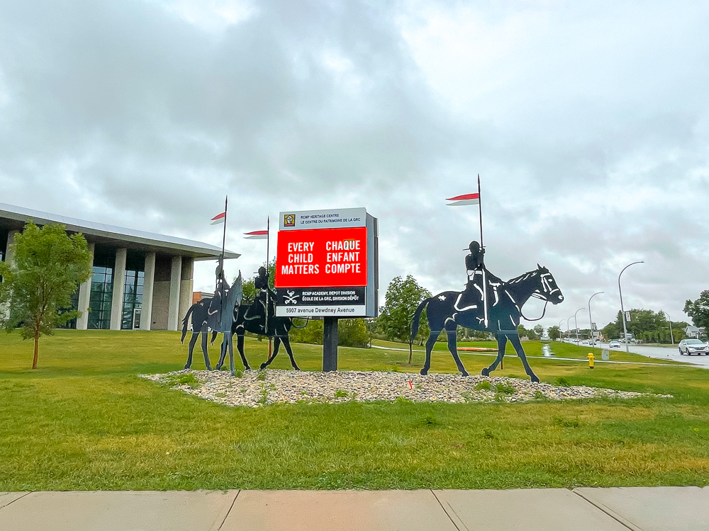 In the gardens, there were orange flags symbolizing each Aboriginal child found dead on the grounds of the residential schools. The pedestal where the statue of Queen Victoria used to stand has been covered with handprints, with red paint, symbolizing the blood of children.