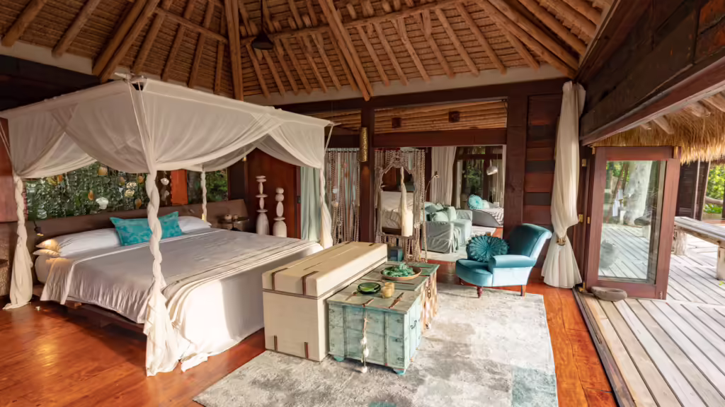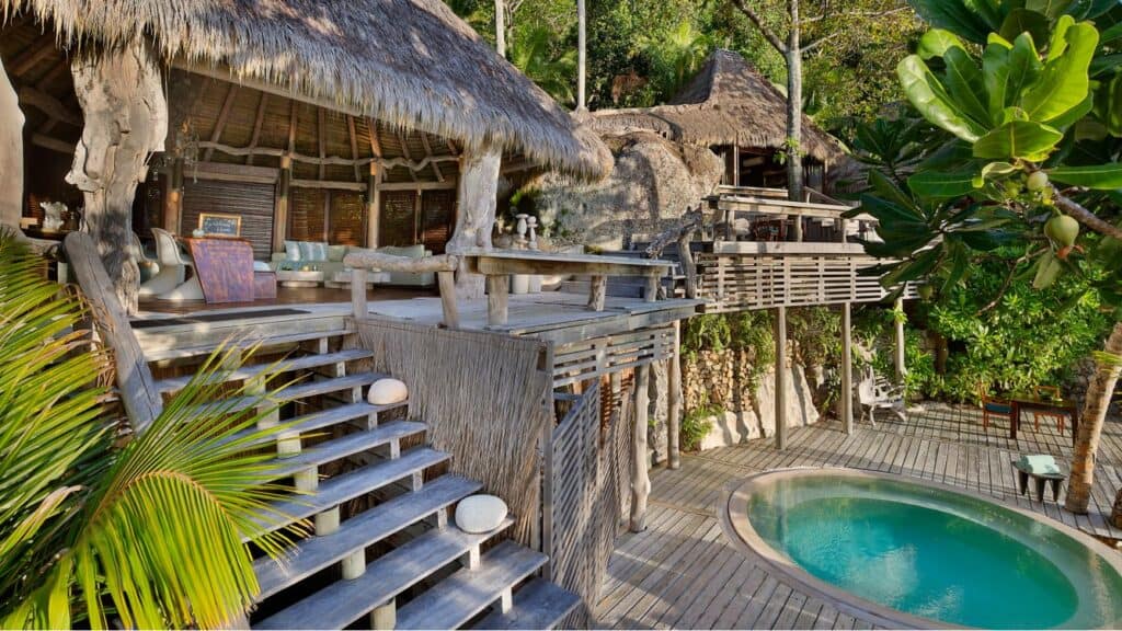 Nestled on a remote island in the Indian Ocean, North Island, a Luxury Collection Resort, Seychelles is accessible only by helicopter. The 11 exclusive villas offer top-of-the-range comfort with vaulted wooden ceilings and private beach access.