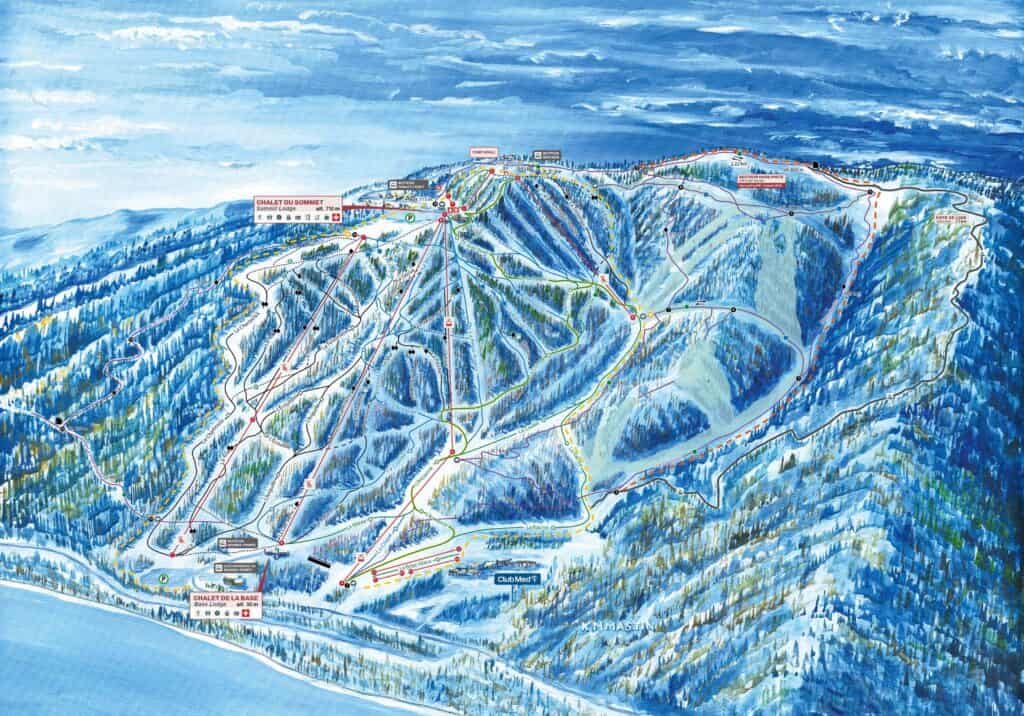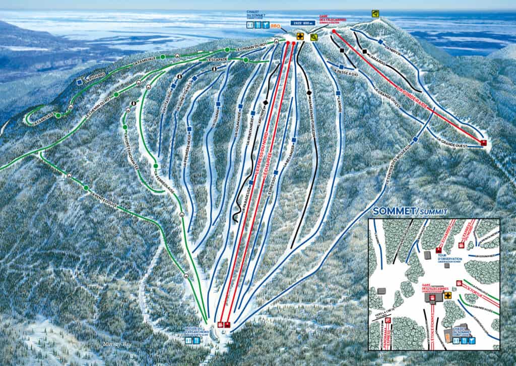 The station is distinguished by its two slopes offering remarkable views, one overlooking the St. Lawrence River and the other looking inland. In addition to skiing and snowboarding, the resort offers snowshoeing and a 200 km network of cross-country ski trails.