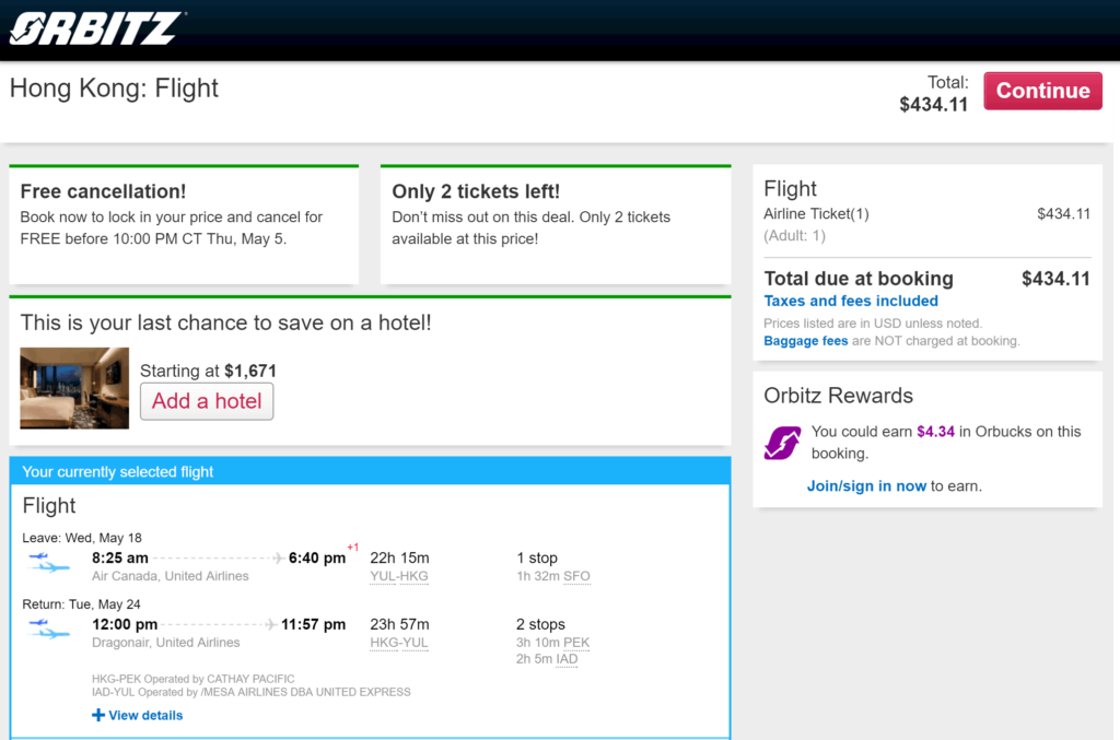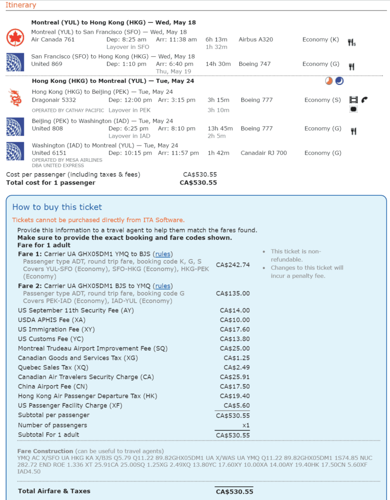 Here is the full screen once we entered our search parameters for our Montreal-Hong Kong flight from May 18-24, 2016: