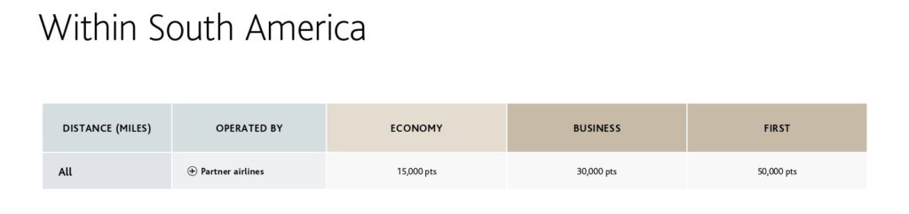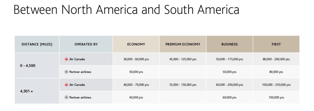 Here is Aeroplan’s chart for travel between North America and South America Zones: