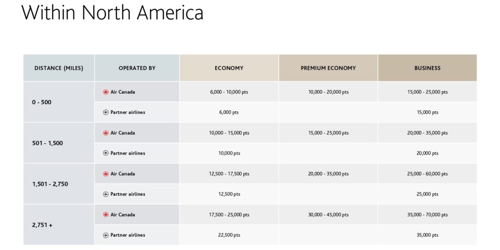 From Montreal or Toronto, many destinations will be accessible within the first threshold. It will cost from 30,000 points one-way.