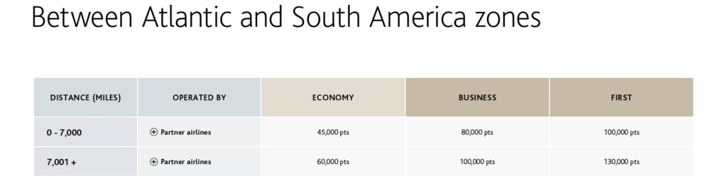 Here is Aeroplan’s chart for travel between Atlantic and South America Zones: