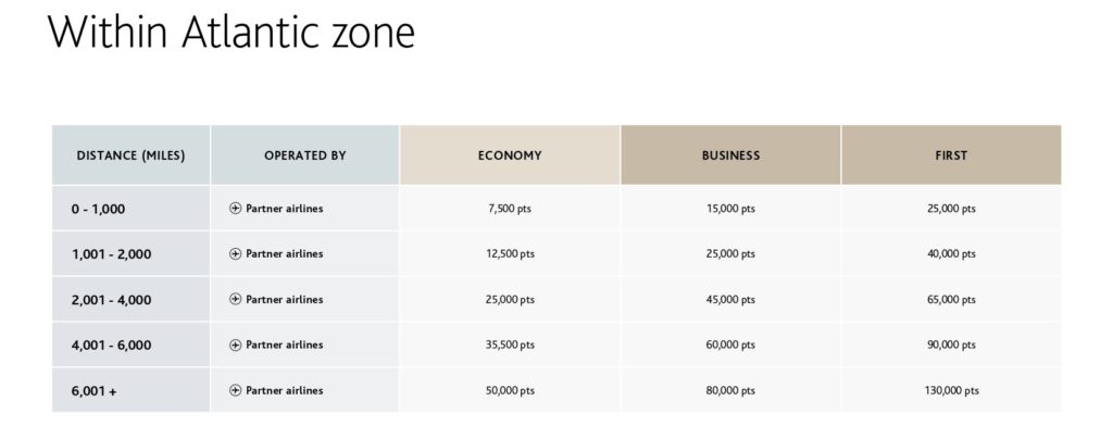Here is Aeroplan’s chart for travel between North America and Atlantic Zones: