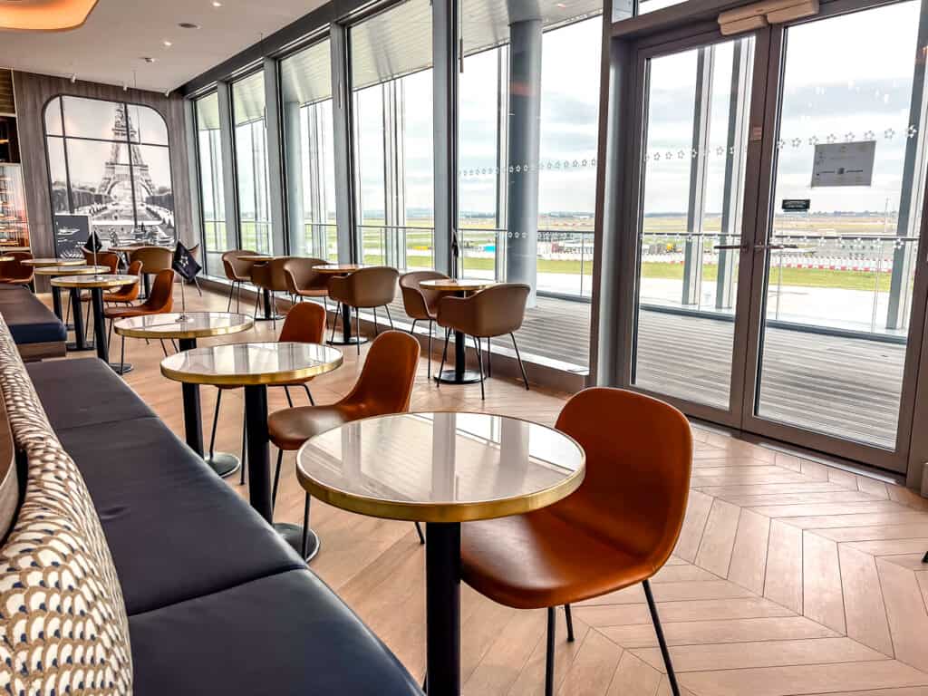 Opposite the Winter Garden, other facilities face the tarmac. The room is still bathed in natural light and decorated with photographs of Paris. A circular structure houses the refreshment station we’ll see next.