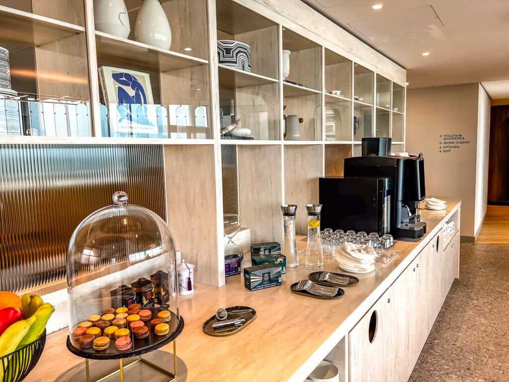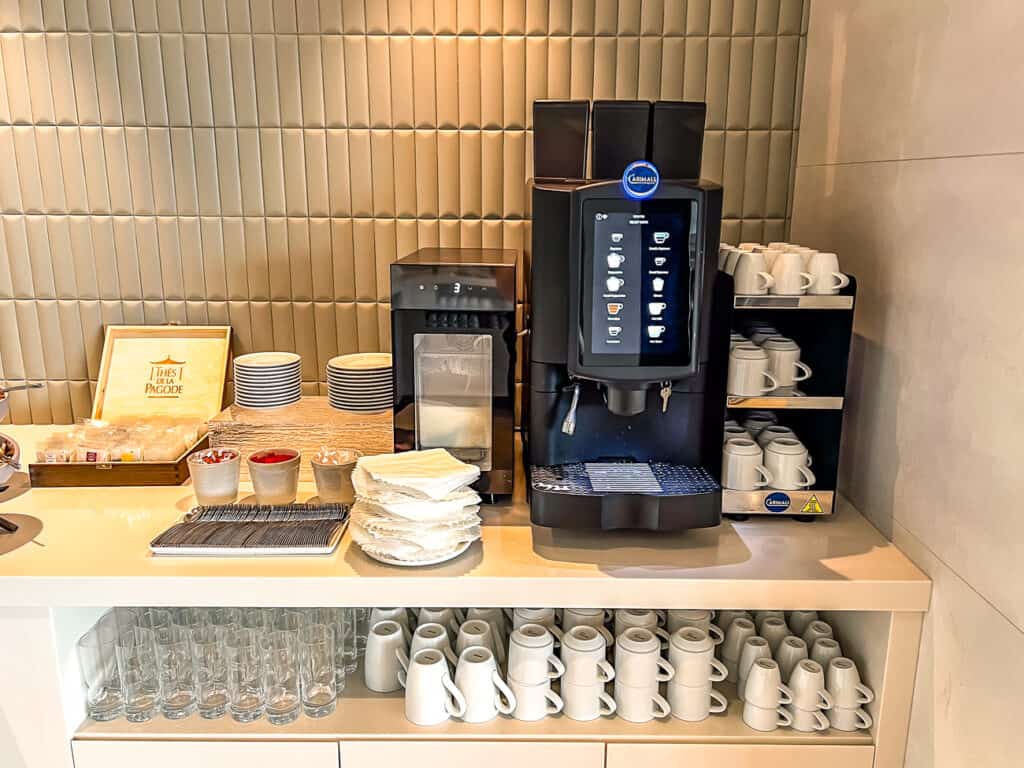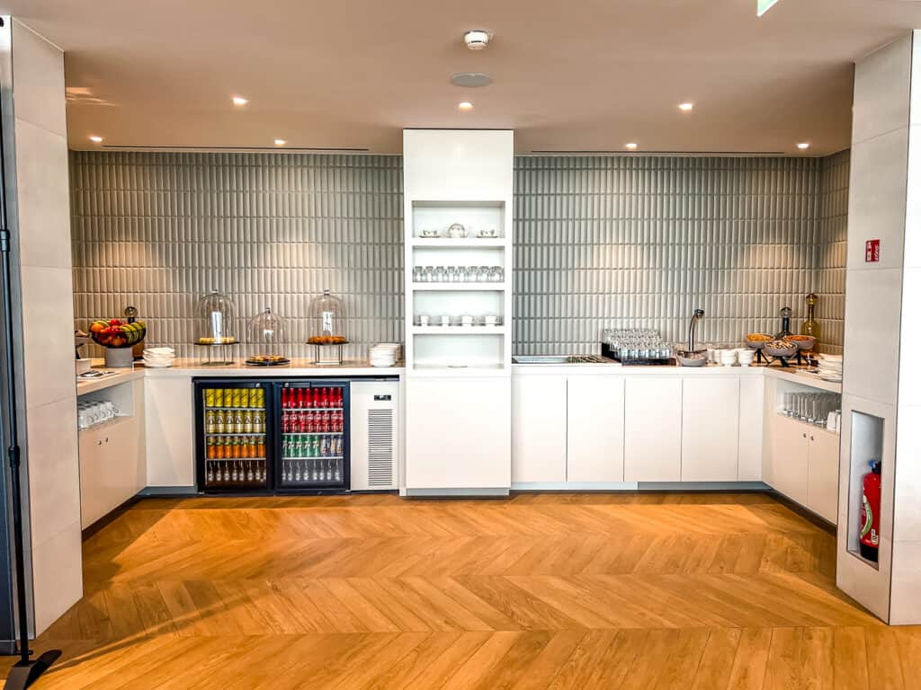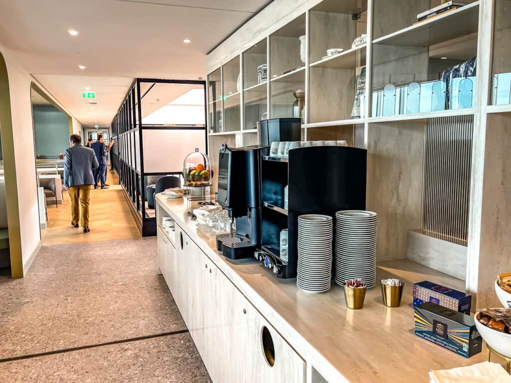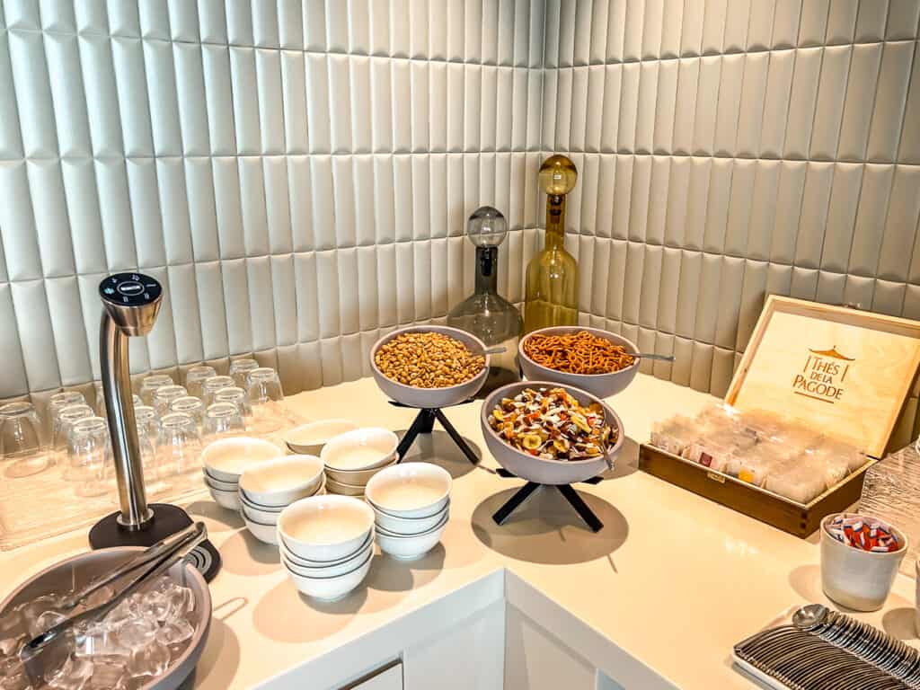 In the Star Alliance lounge at Paris-Charles de Gaulle, once you’ve passed the kiosks, you’ll find an open welcome bar with a captivating, minimalist design offering a variety of beverages.