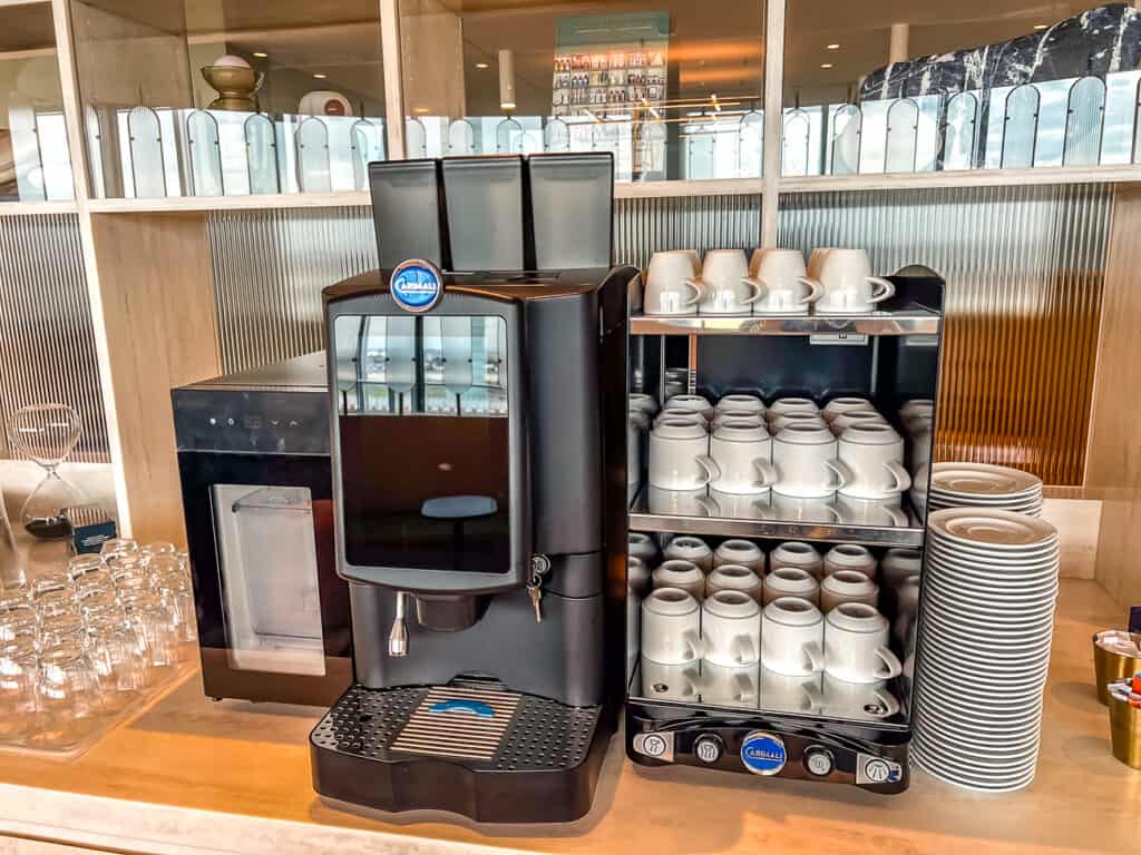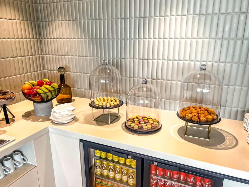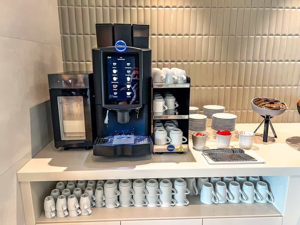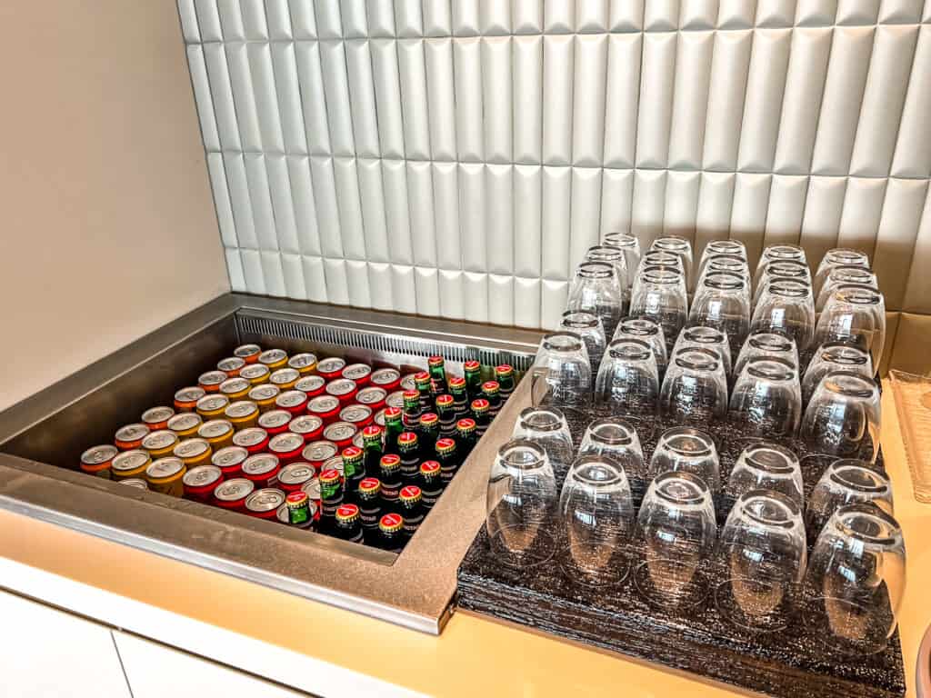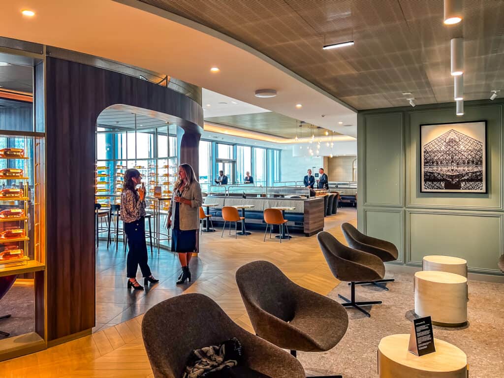 In the Star Alliance lounge at Paris-Charles de Gaulle, once you’ve passed the kiosks, you’ll find an open welcome bar with a captivating, minimalist design offering a variety of beverages.