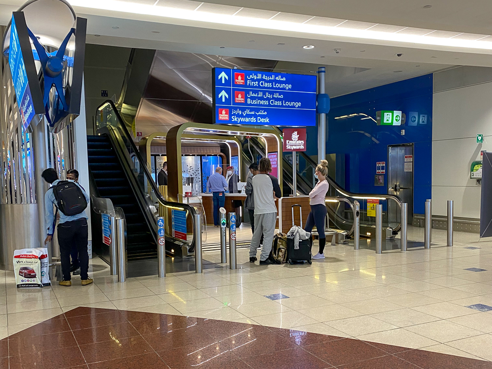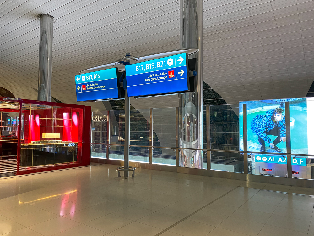 The Emirates Business lounge is located on the second floor of the terminal, accessible by escalator or elevator.