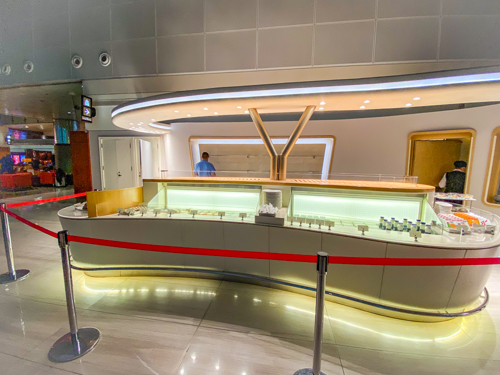 Due to the size of the lounge, several food counters are in place to prevent large lines from forming. We find at each counter more or less the same dishes. The service is courteous.