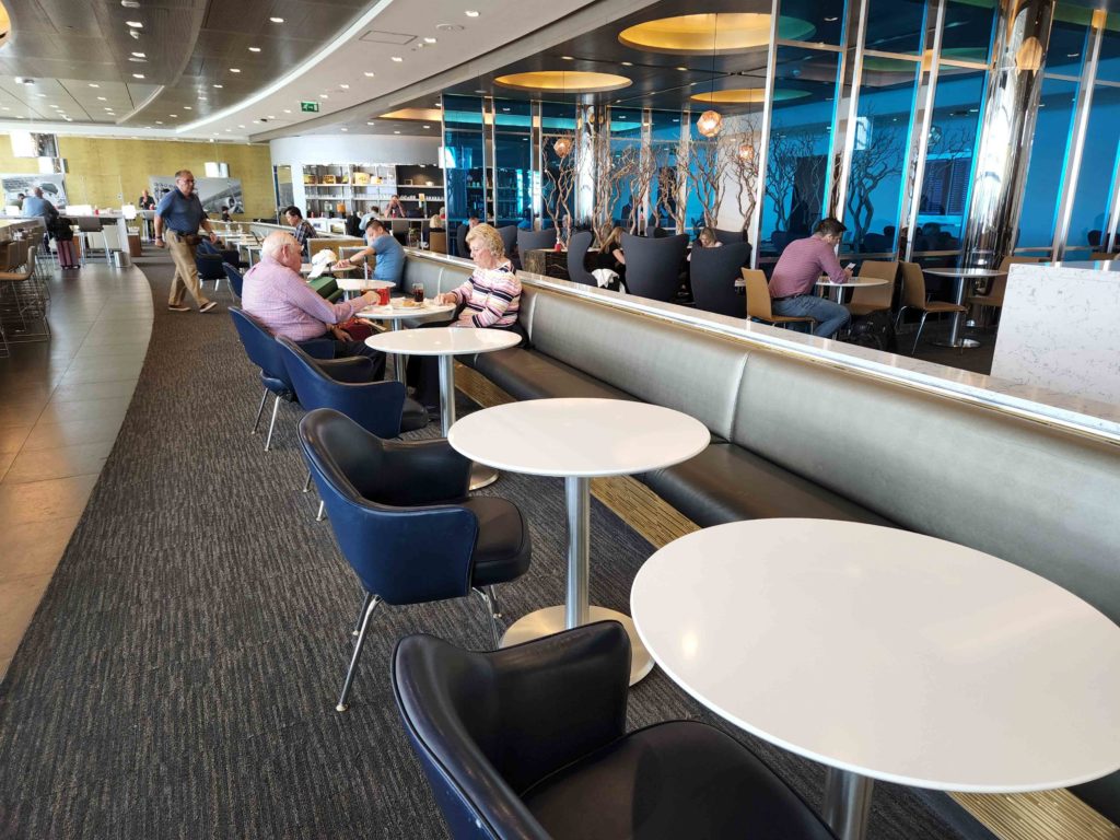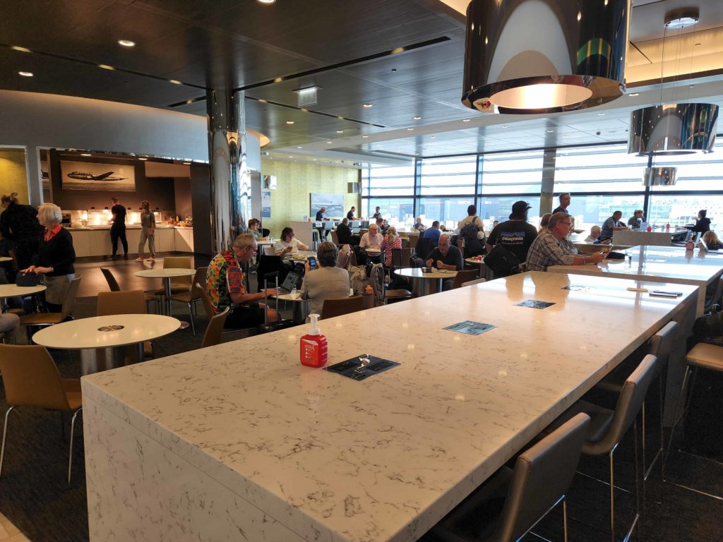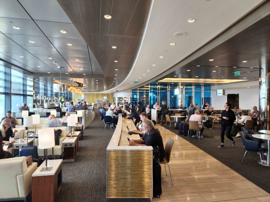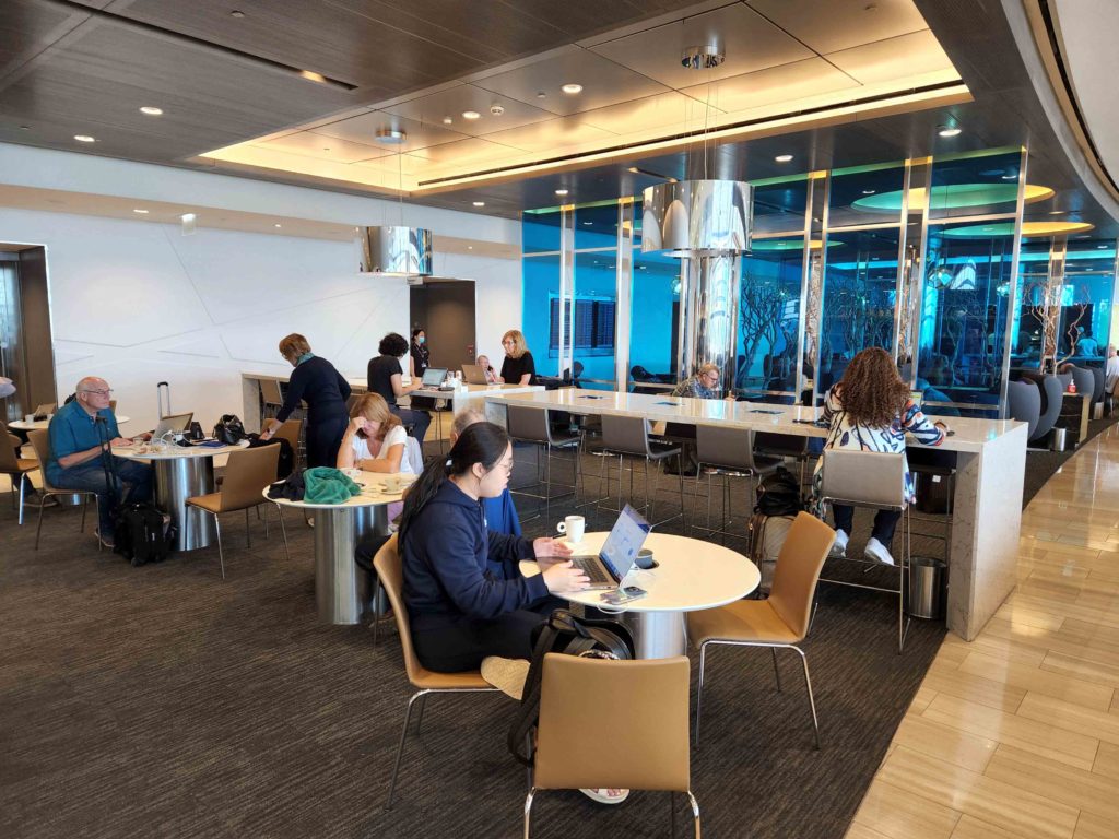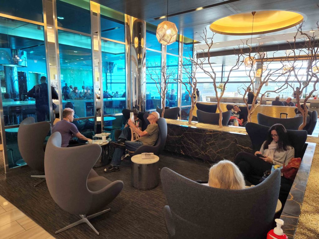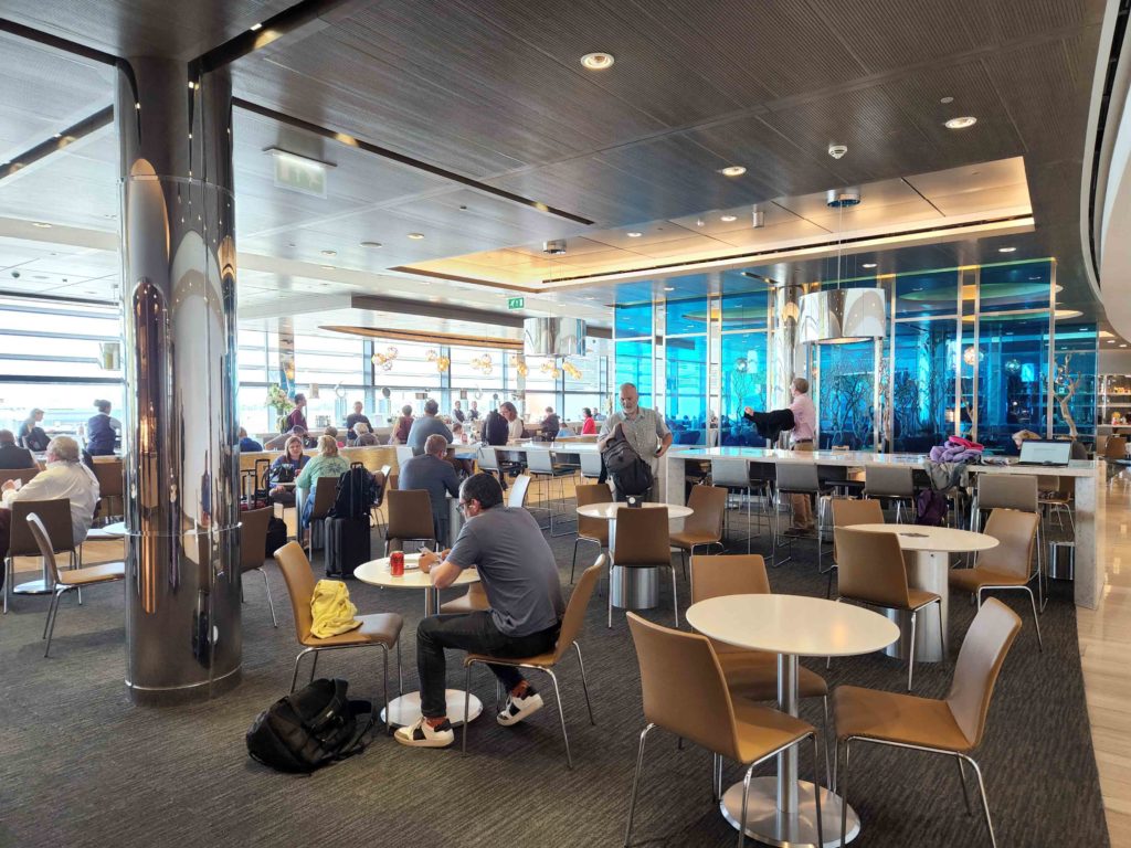 The lounge is quite large and features various styles of comfortable seating along with lots of power ports. One thing I loved about it is that it’s a fairly long but narrow lounge, with floor-to-ceiling windows along the entire length. This allows for a lot of natural light and provides a bright, airy feeling inside. I was there from late morning until early afternoon and while the lounge was busy, it wasn’t overly crowded. There is seating for 280 guests.
