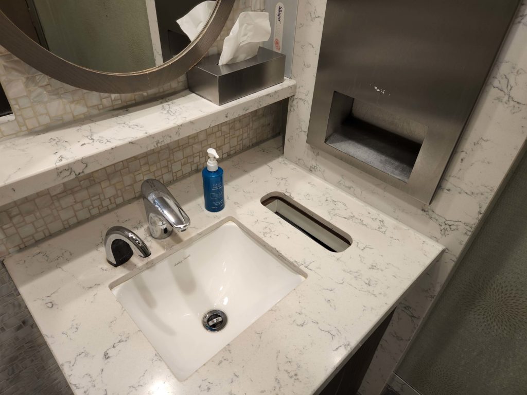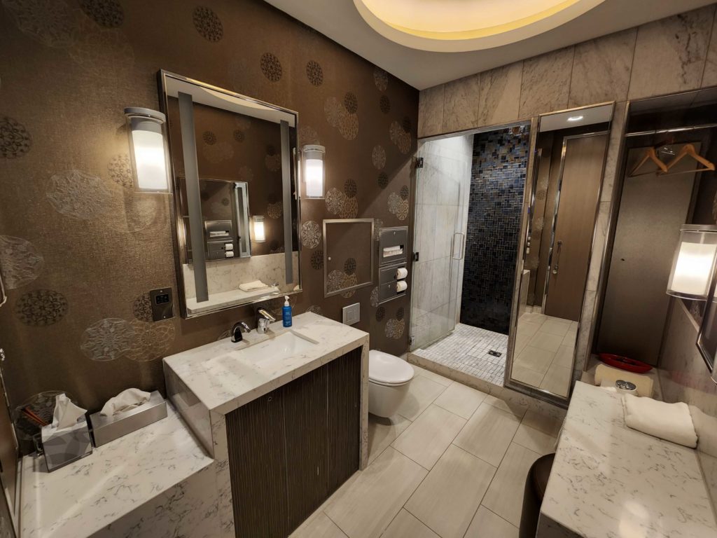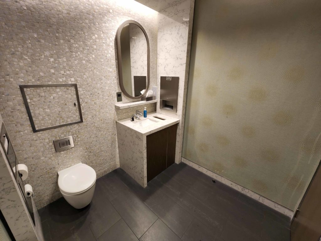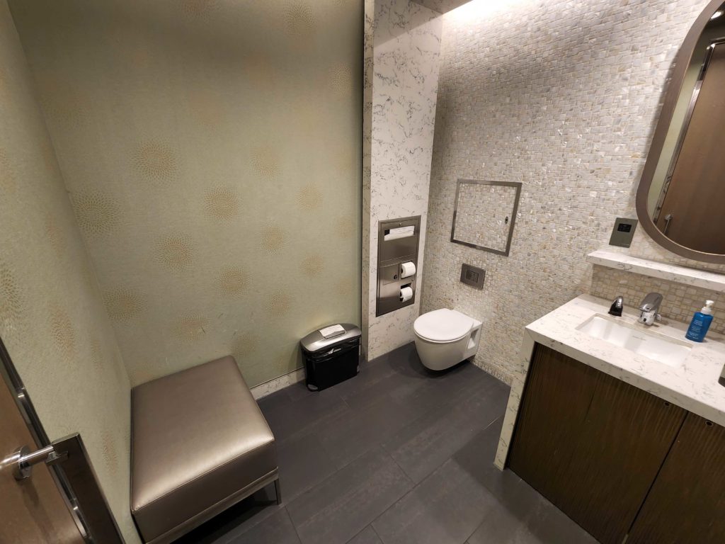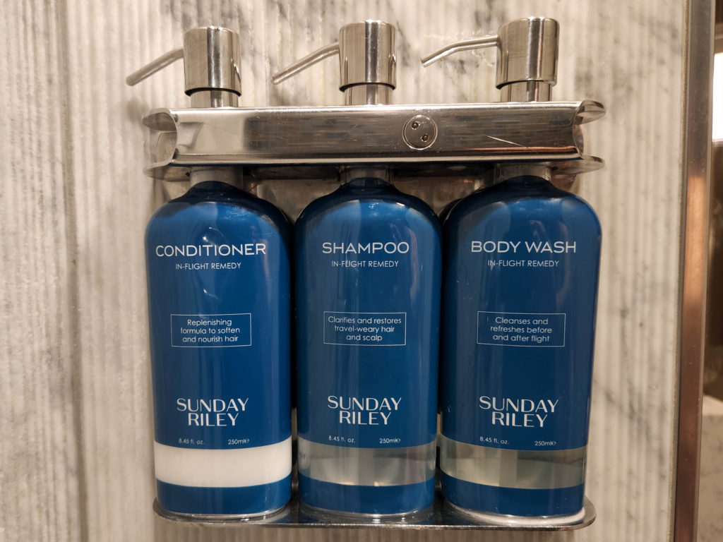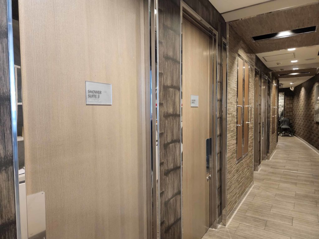 The lounge has 8 large and very well-appointed shower suites. They feature a toilet, sink, rainfall shower, vanity sitting area with mirror, Sunday Riley personal products, a small closet, and a door where you can pass the valet your garmets for pressing. The room was spacious, comfortable, and the shower had great water pressure.