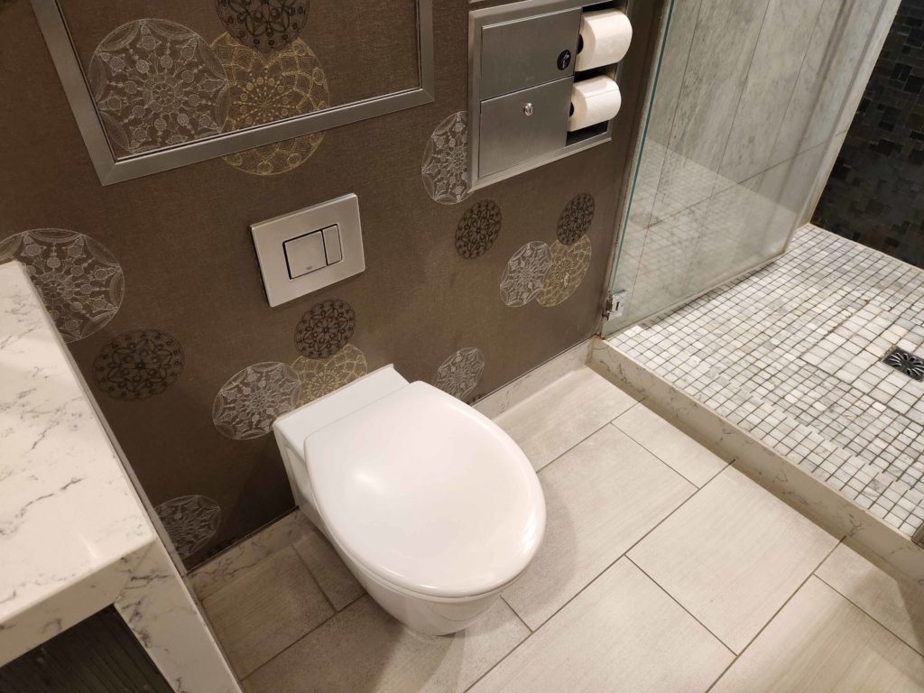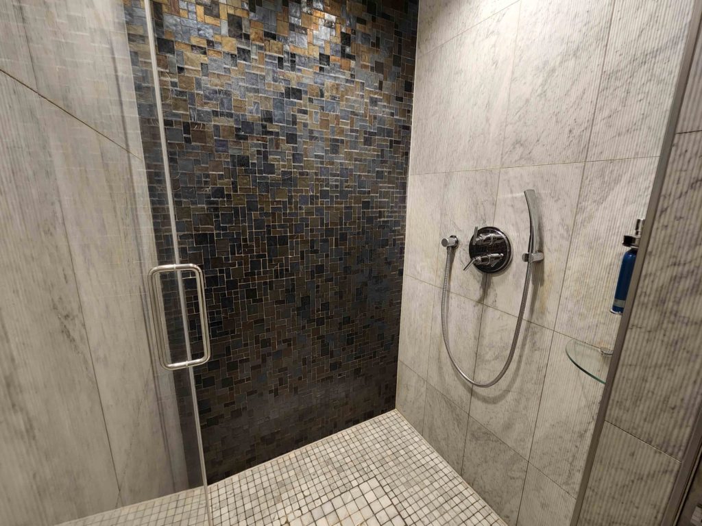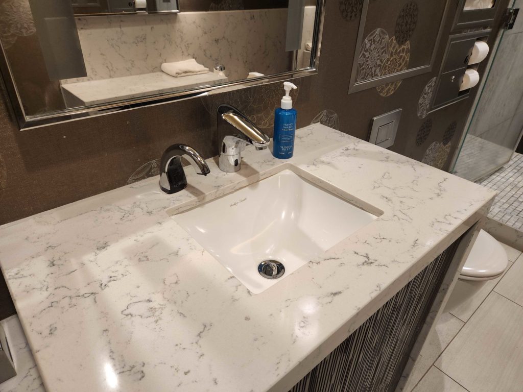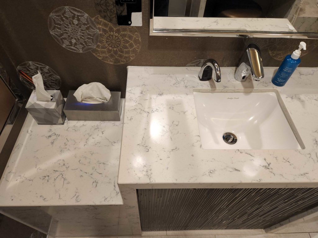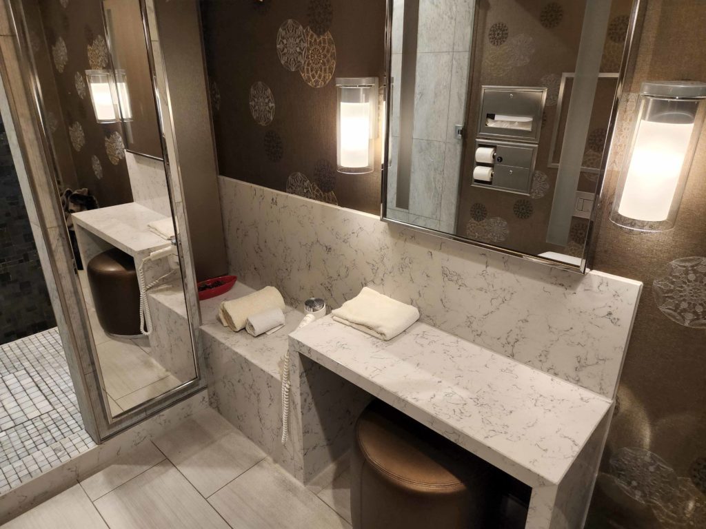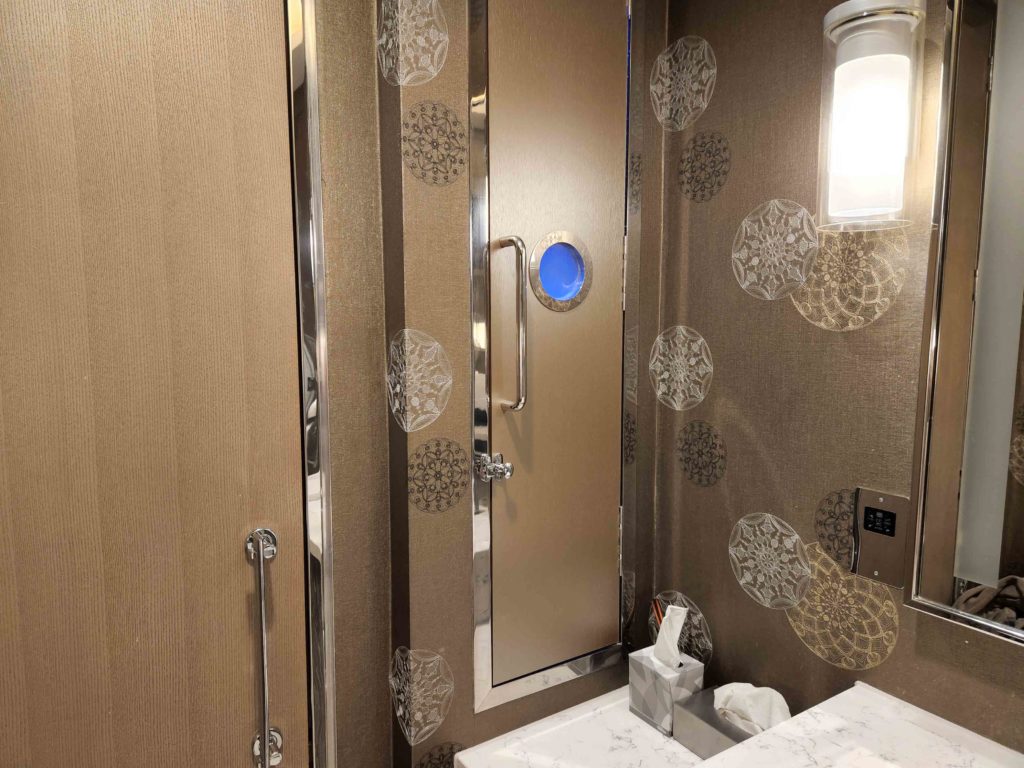 The lounge has 8 large and very well-appointed shower suites. They feature a toilet, sink, rainfall shower, vanity sitting area with mirror, Sunday Riley personal products, a small closet, and a door where you can pass the valet your garmets for pressing. The room was spacious, comfortable, and the shower had great water pressure.