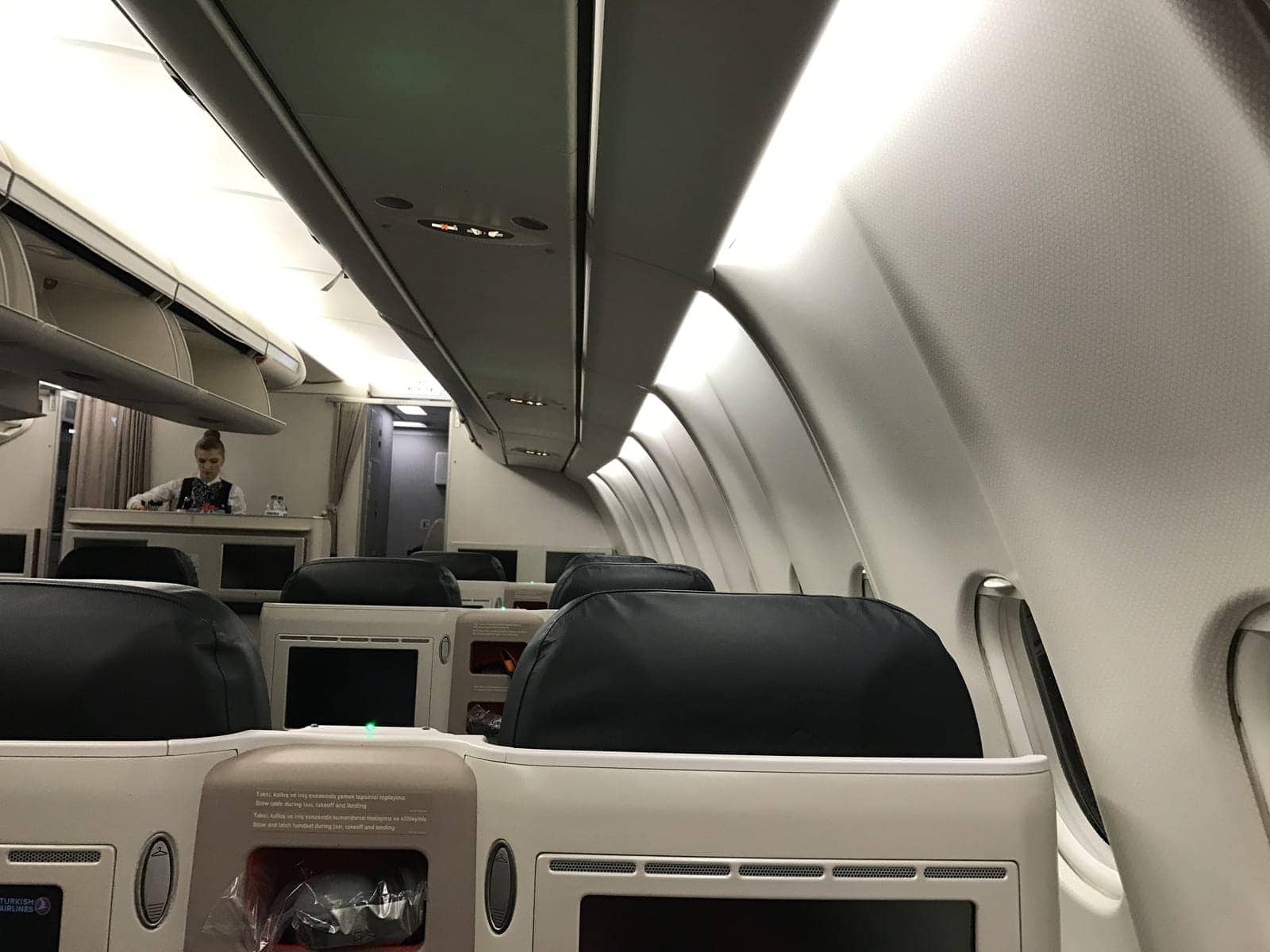 The boarding is already in progress when we present ourselves at the door, we arrive in this rather old-fashioned cabin, although the aircraft (TC-JOD) is hardly 2 years old. It must be said that the colors and lighting do not help.