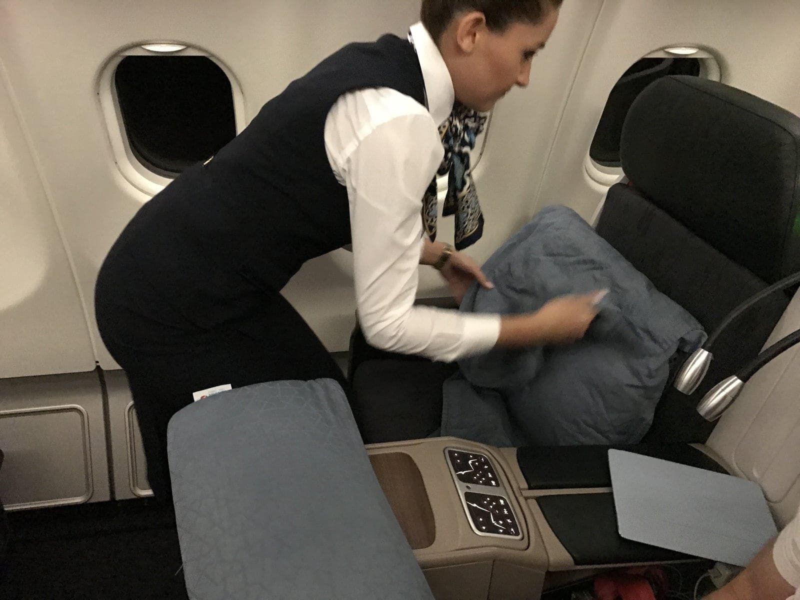 I didn’t even finish my meal, it was time for me to sleep. Flight attendants pull out a small mattress topper that hooks onto the seat. Not very thick but the blanket and the cushion are comfortable.