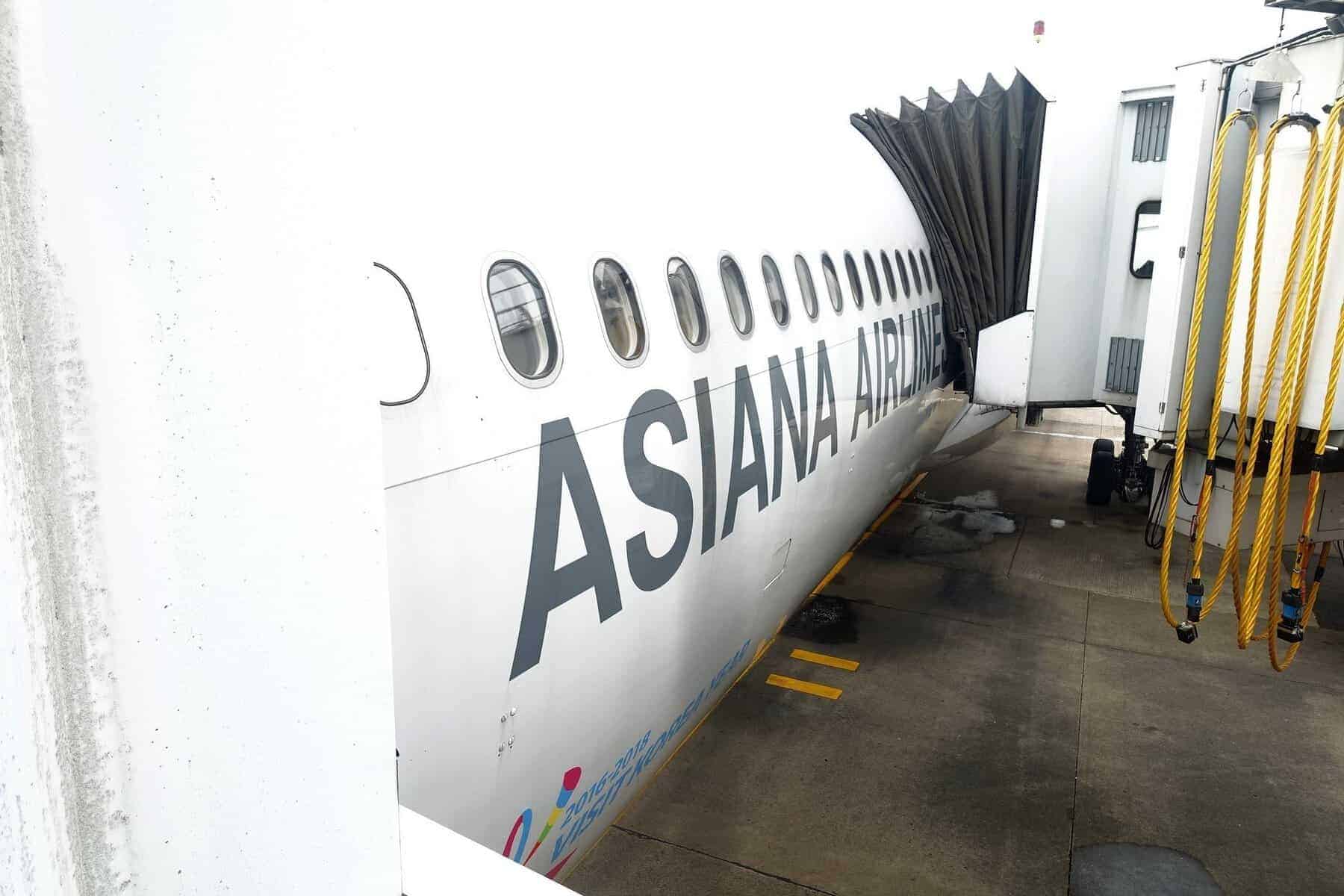 While going down the escalator, we have a nice view of our plane of the day: an Airbus A330 of Asiana Airlines.