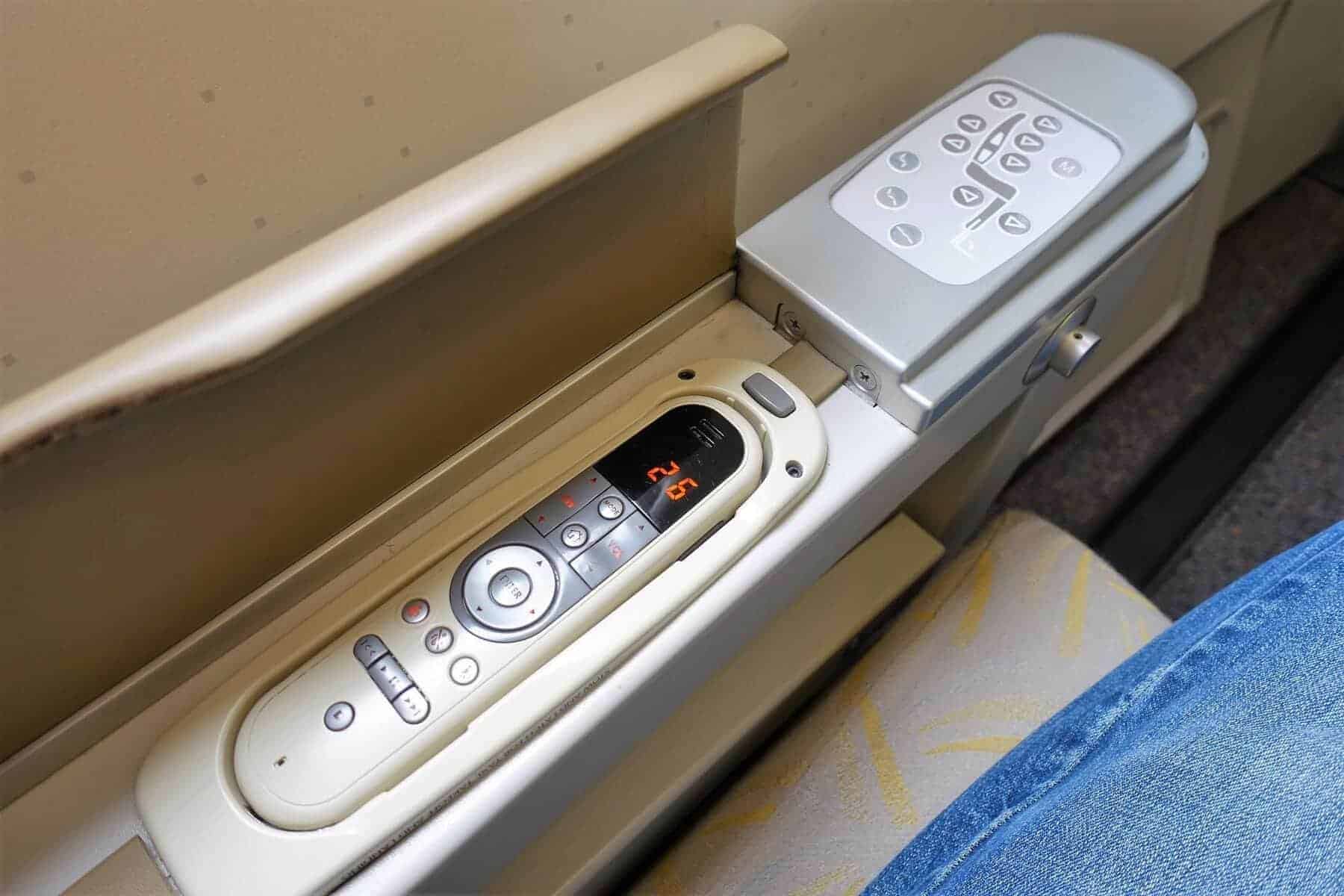 The remote control is located in the armrest, which also contains the seat adjustment buttons.