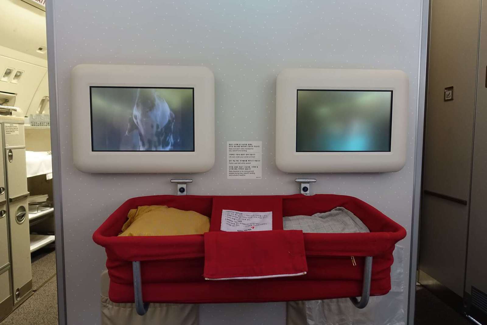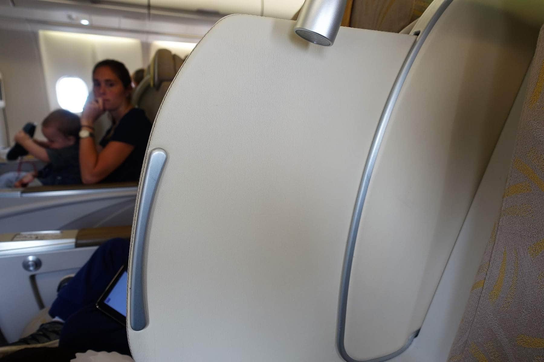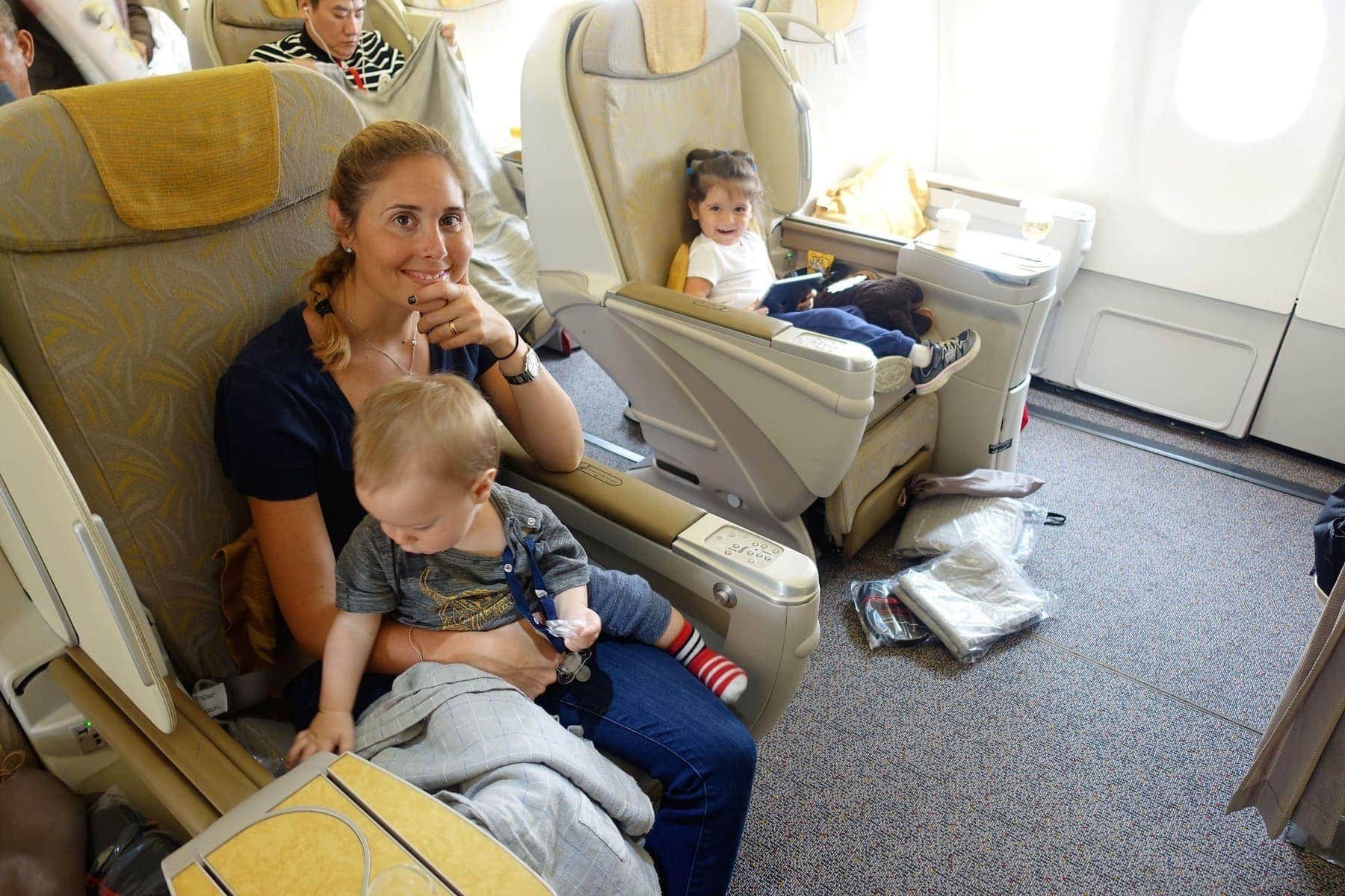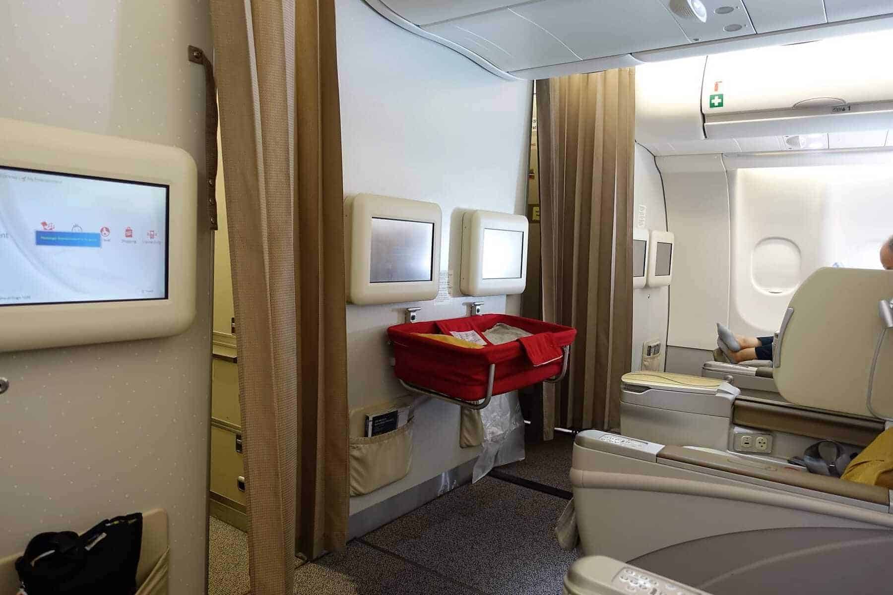 Once through the door, we won’t have many meters to go: we will be in the first row. Alexandra then embarks on a long process of selecting the seat out of the 4 at our disposal (3 in reality, but 1 was kindly “blocked” for us at check-in to be comfortable with baby).