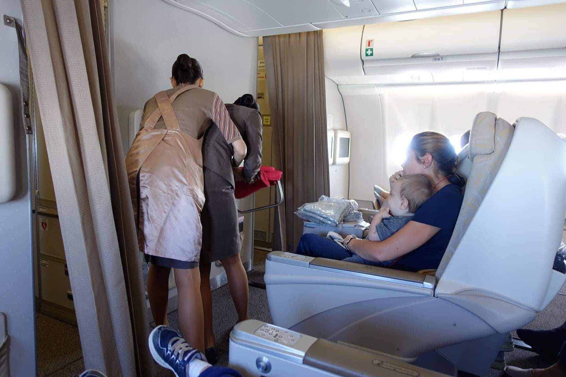 Shortly after the takeoff, the flight attendants will come to install… not without difficulty the baby bed / bassinette for Arthur.