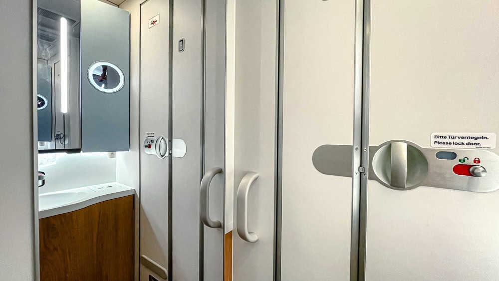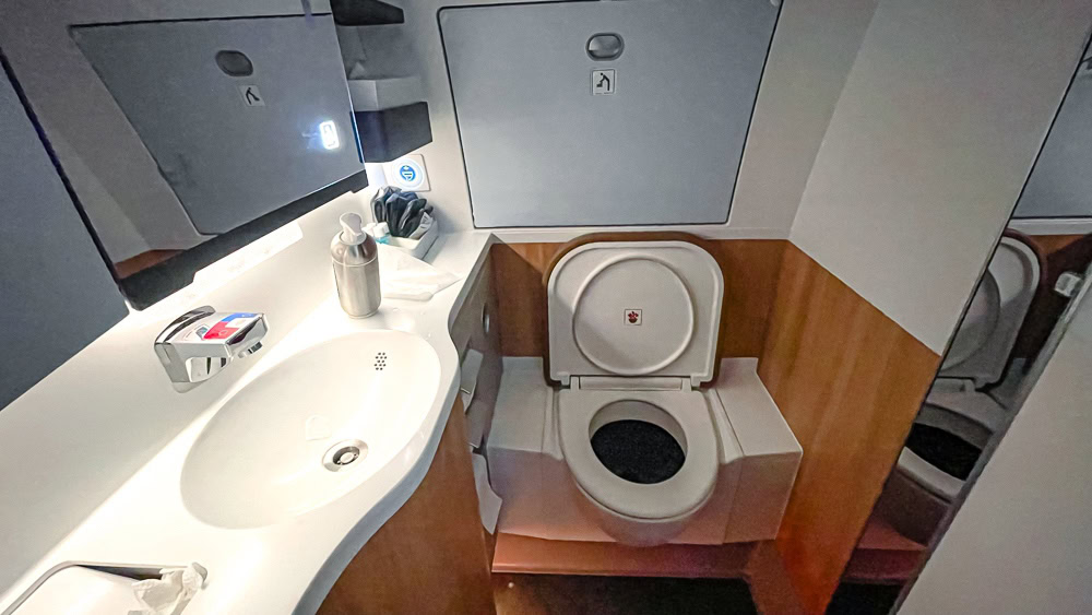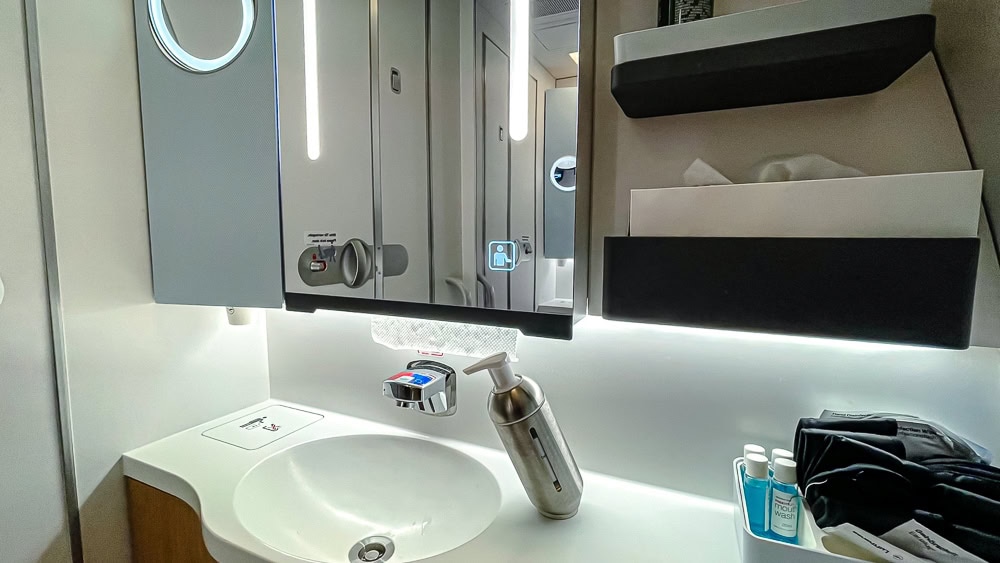 There are two rather small toilets in business class. They are, however, also designed for “grooming”. In other words, the seat is covered in leather so that you can sit comfortably, for example, to use the magnifying mirror. Once again, L’Occitane products are available.