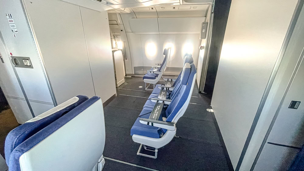 Row 7 (only two seats, as the center is partly occupied by the gallery), which “ends” the first of the two cabins, also offers slightly more space and privacy thanks to its configuration.