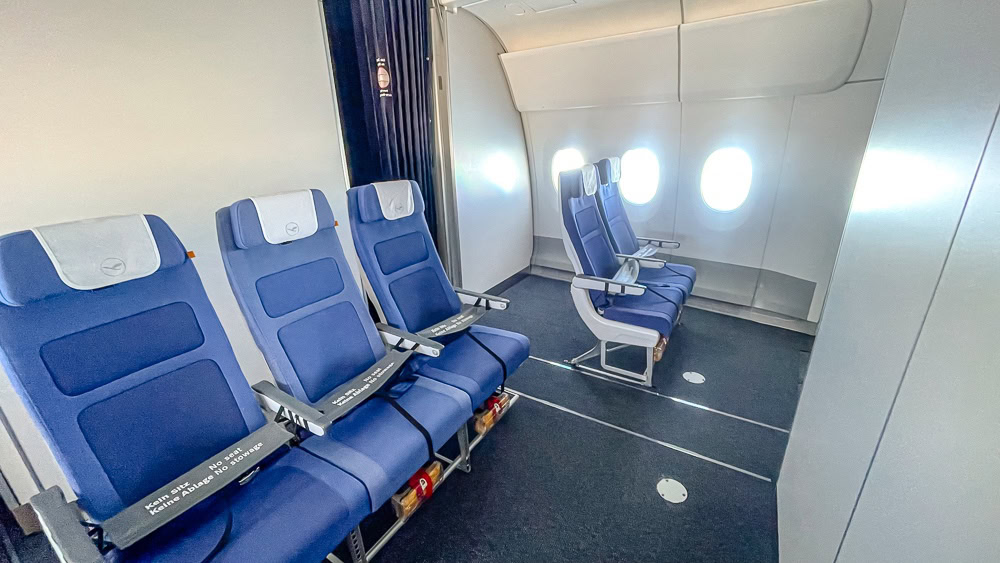 Although space for First Class was available on the aircraft, and in the end there will only be row 1 in First Class, the four First Class seats (1-2-1 configuration) had not yet been installed on our aircraft. In the interim, Lufthansa had put in empty “economy” seats.