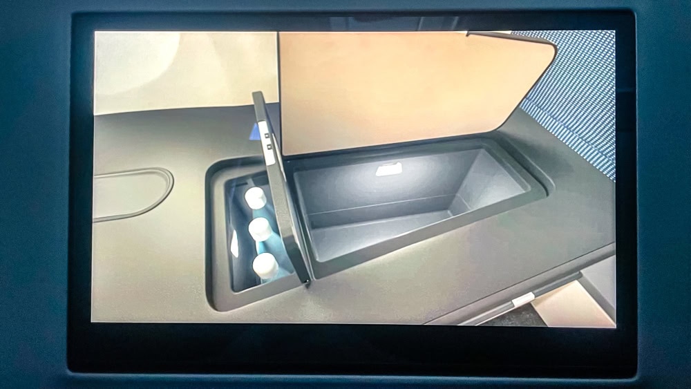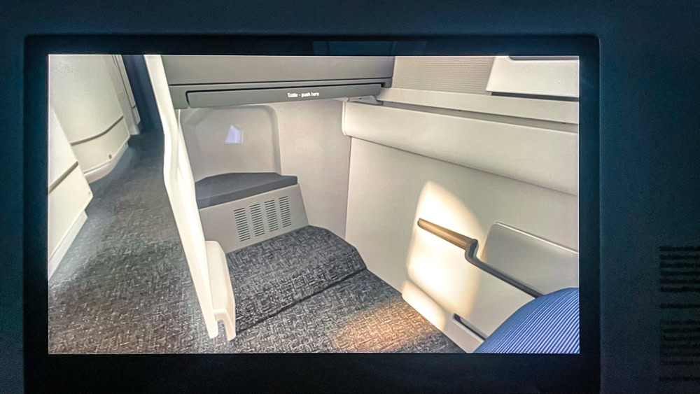 The retractable table used for eating or working is very long. It’s the first time I’ve seen one this long. My friend, who spent a good part of the flight working on it, particularly appreciated this extra space.
