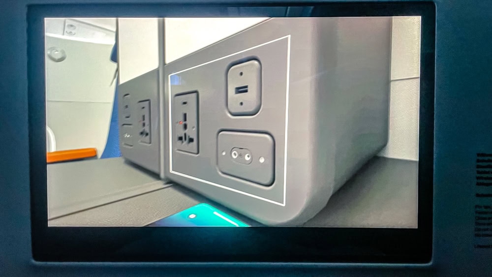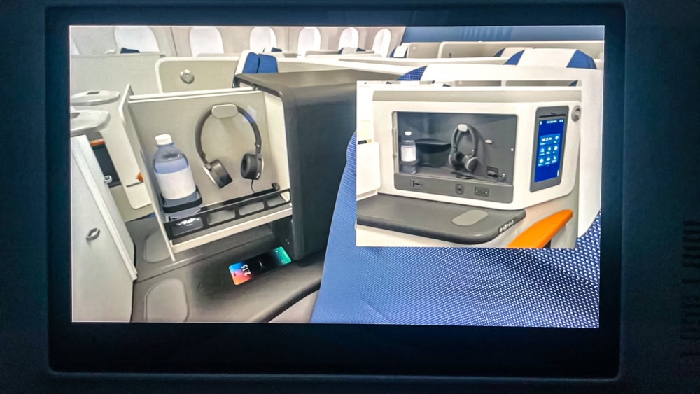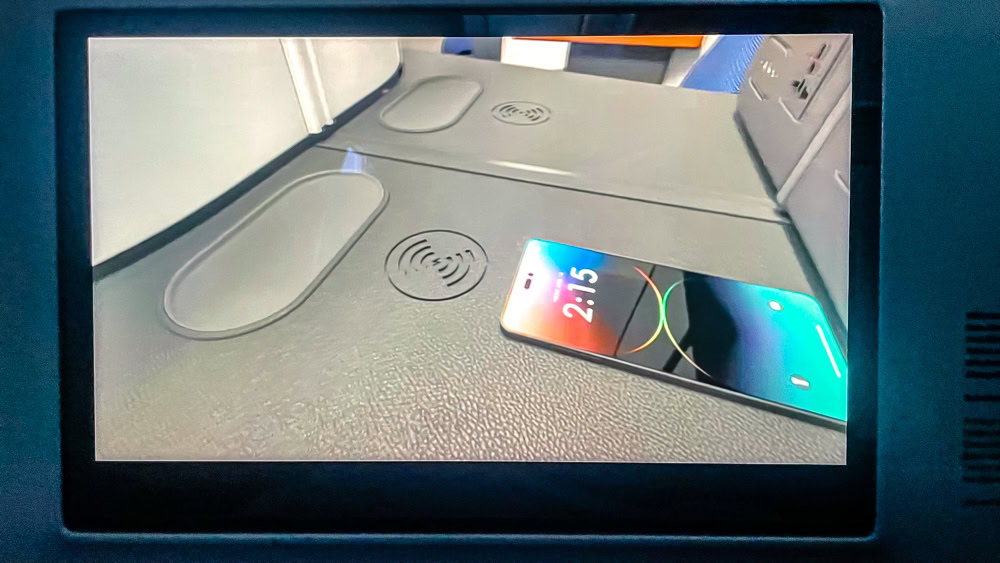 On the flat surface in front of the compartment drawer, Lufthansa has integrated a magnetic wireless charger designed to recharge devices that accept this charging mode (e.g. recent cell phones). You either like it or you don’t, because to recharge, the cell phone has to be placed there, making it difficult to use at the same time, which is not the case when recharging with our cable.