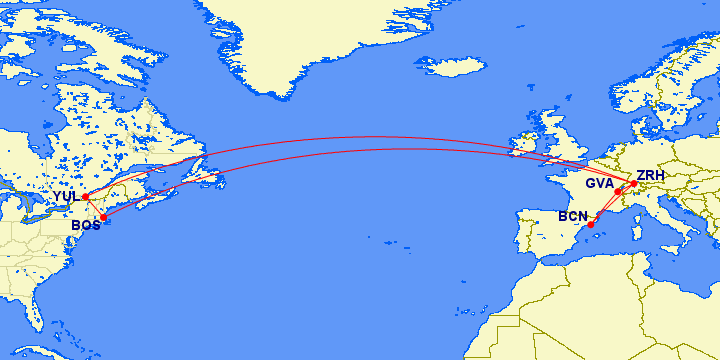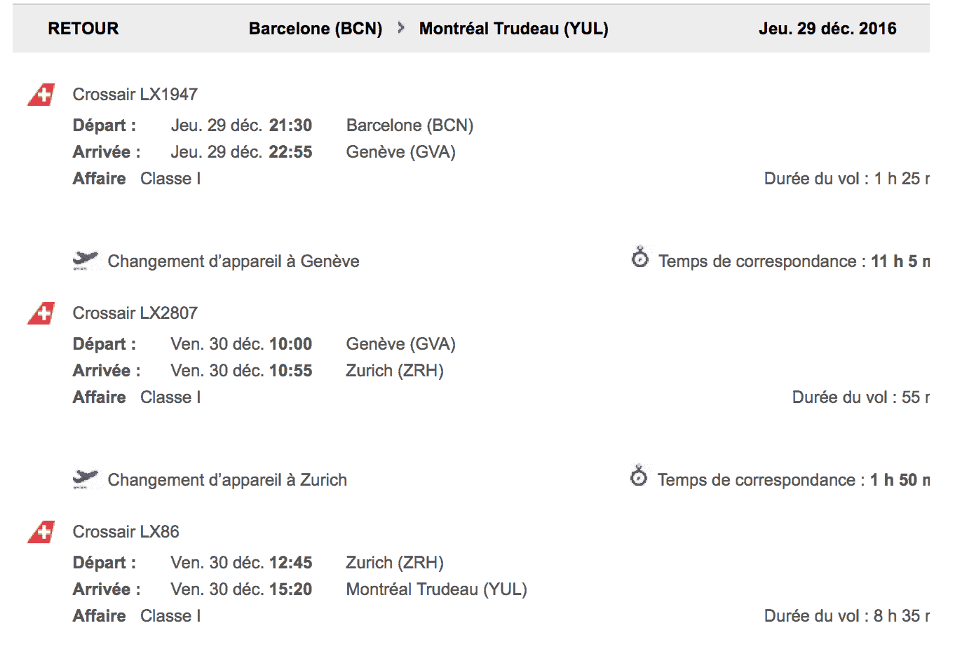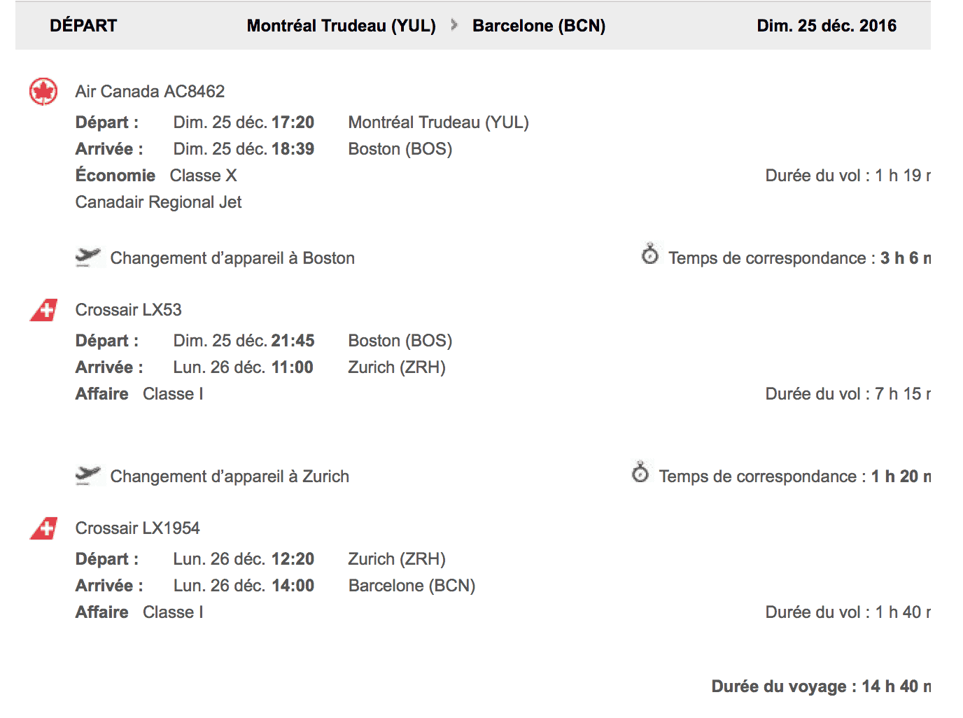 But looking closer at Swiss flights from the US East Coast, I see availability with Aeroplan from Boston and New York. I then look at the Montreal-Boston segment and I find several flights available in economy class (which is normal because the flight is operated with a CRJ200 which does not have business class).