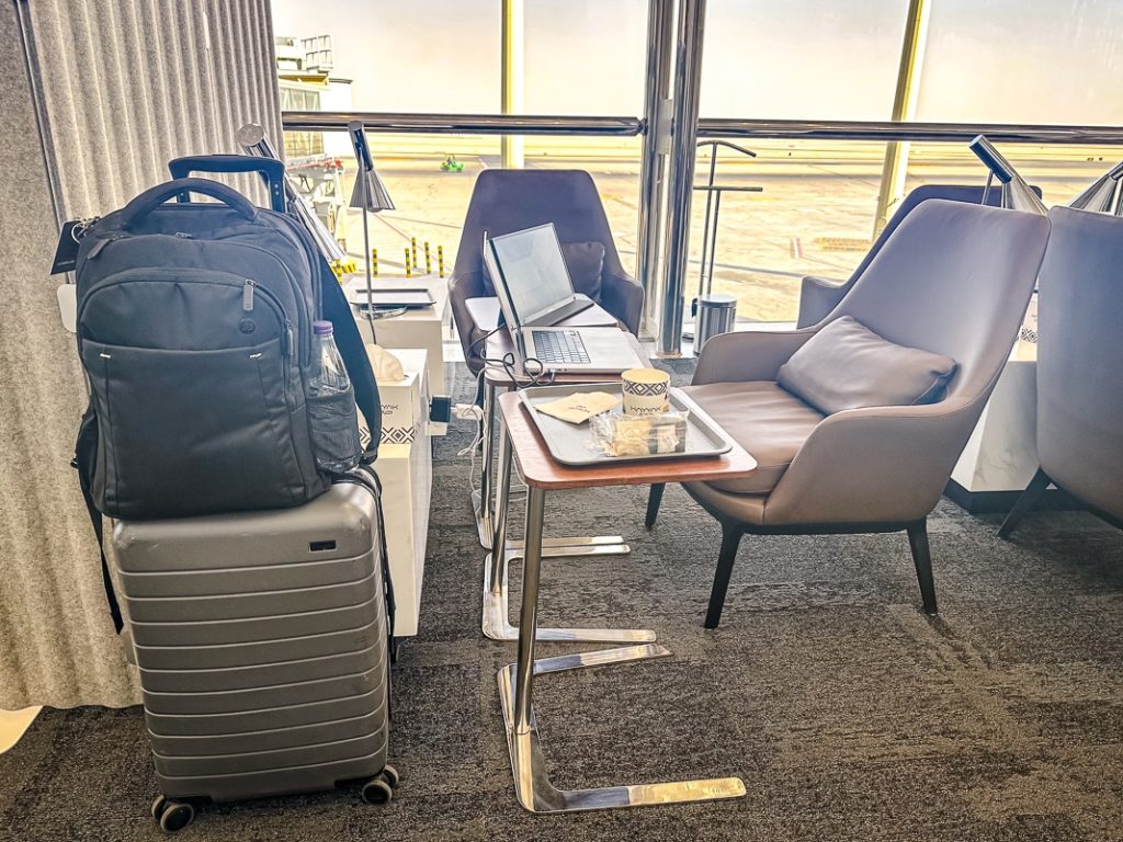 It is a comfortable space with leather chairs (each with access to electrical and USB outlets).