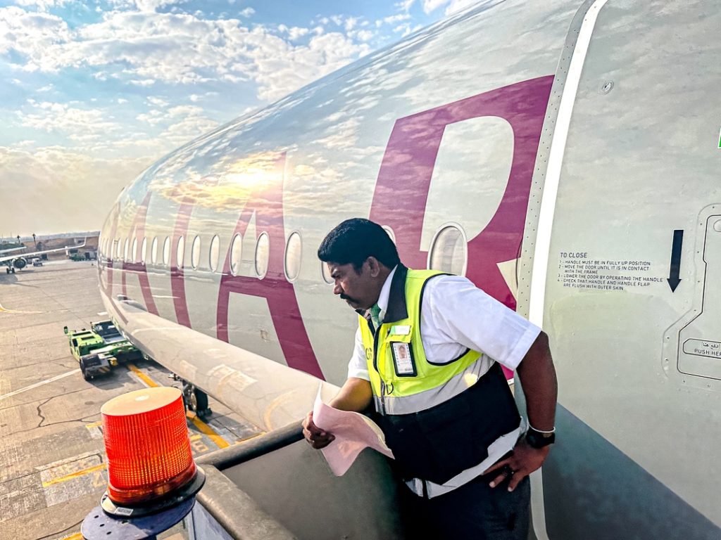 After a few minutes on the tarmac, we are at the foot of the Qatar Airways Airbus A350-1000 for boarding via the second gate.
