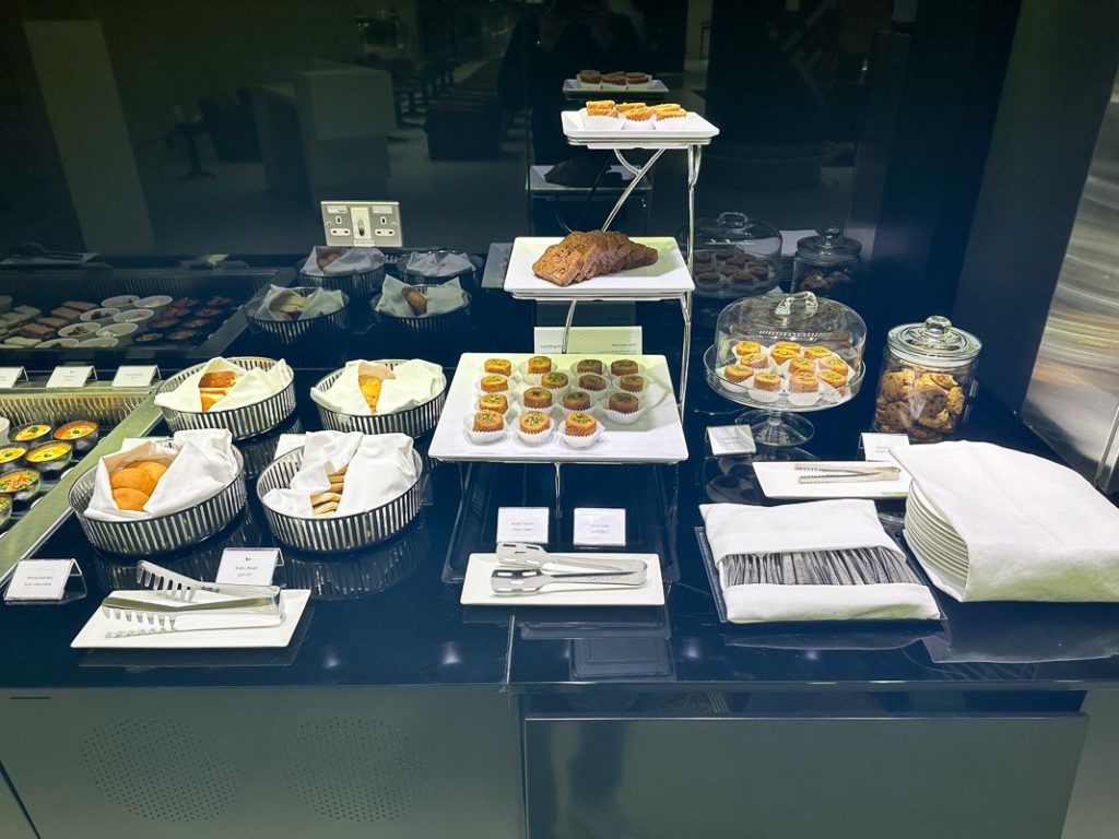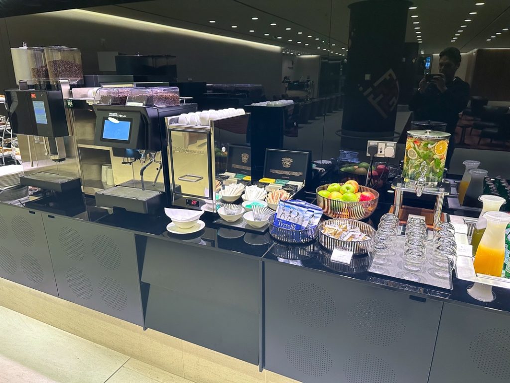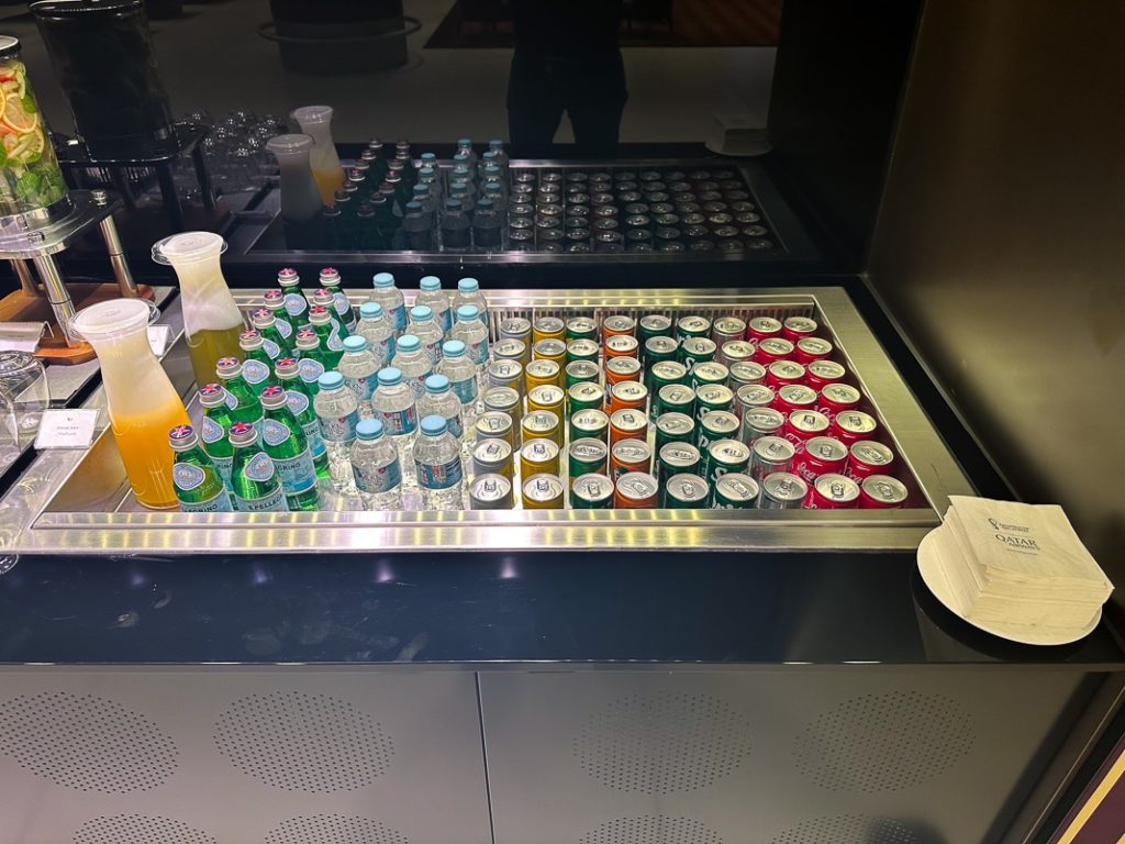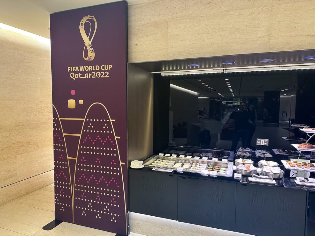 In fact, I was the only passenger to get here. A buffet of cold dishes and drinks was available, with a World Cup theme throughout the space.