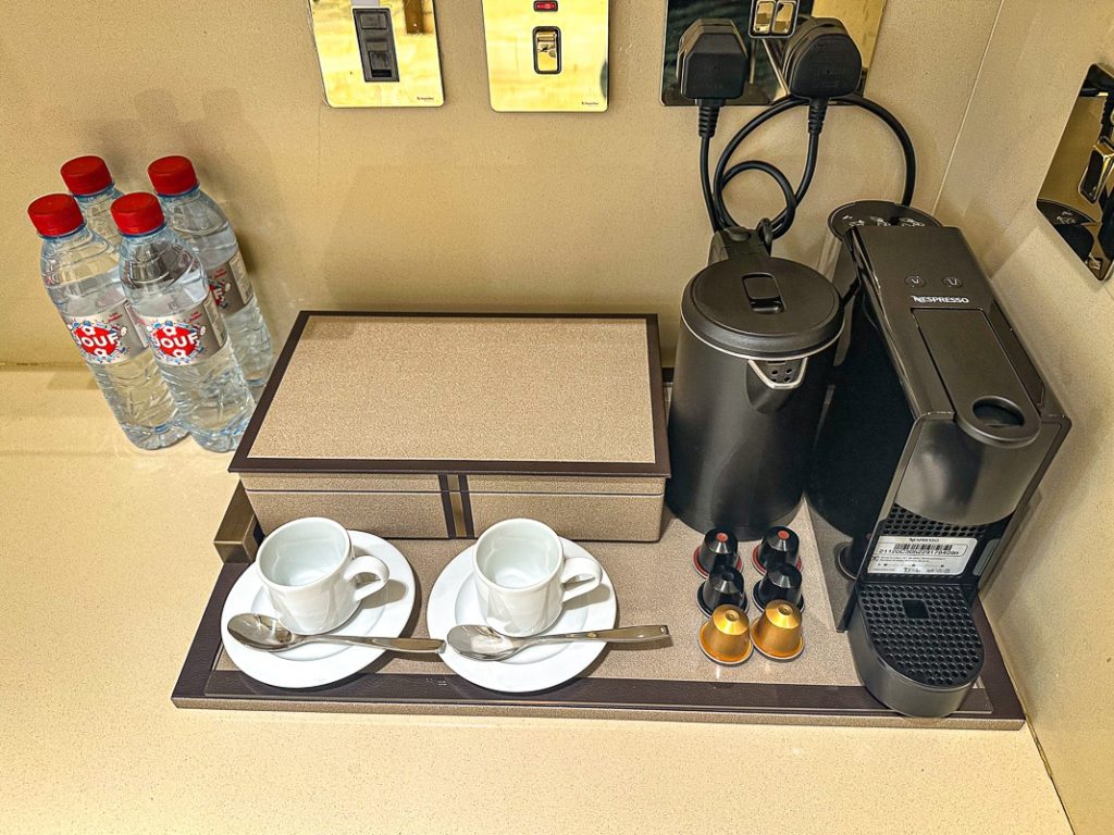 The person operating the front desk coffee shop brought me a refreshment during the check-in process.