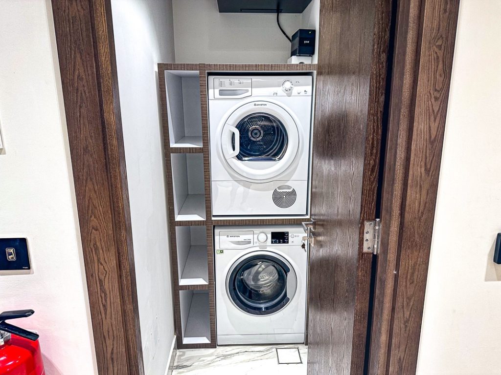 In the entrance hall, there is a bathroom with a toilet, a washing machine, and a dryer.