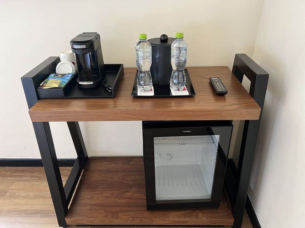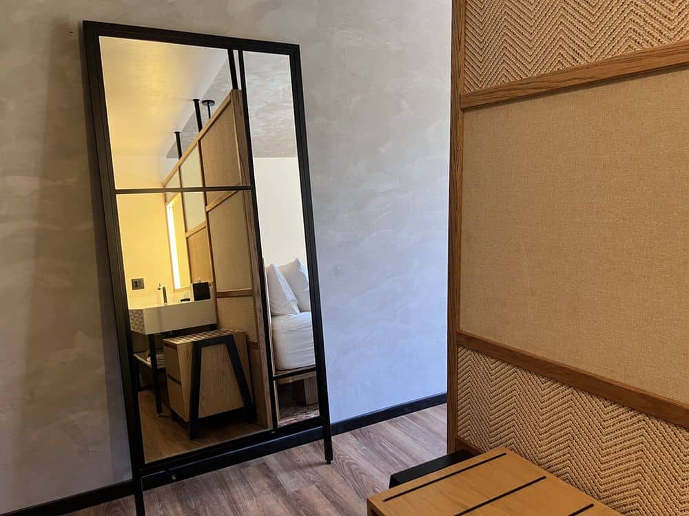 A bench seat, a flat screen TV, a large mirror and a small station with mini-fridge and coffee machine furnish the room which offers a modern and almost bohemian style, with a touch of color.