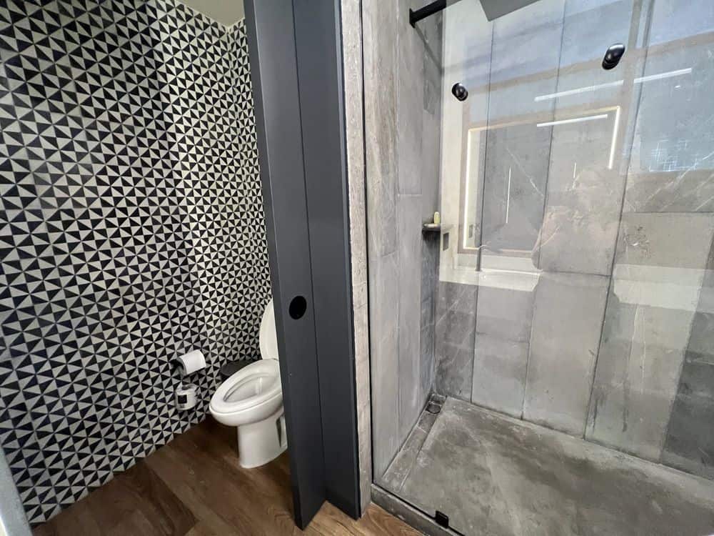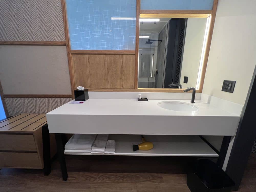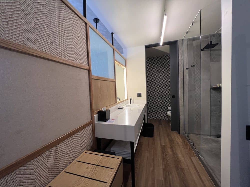 A half wall separates the bedroom section from the bathroom. The latter includes a long vanity, a walk-in rain shower (with no cover or curtain, a fact worth noting when traveling with friends) and an enclosed toilet.