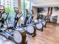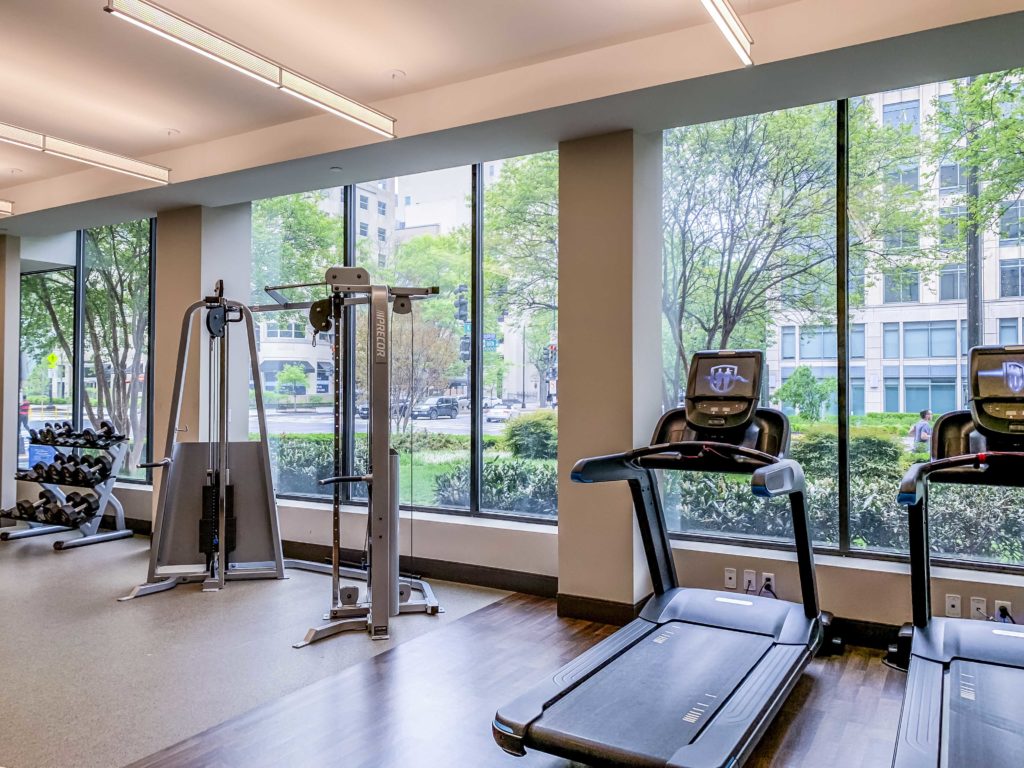 The fitness room is long and has a lot of light with its large windows.