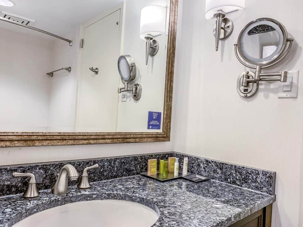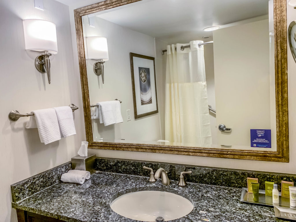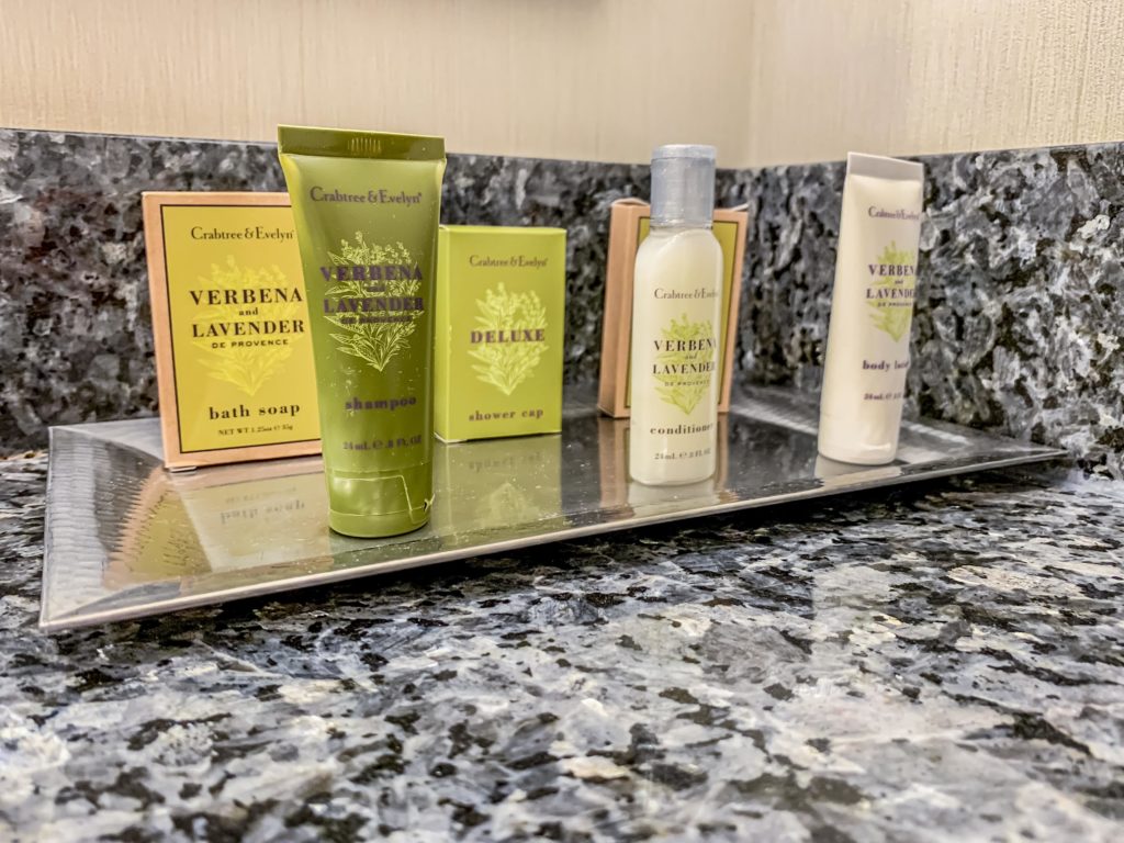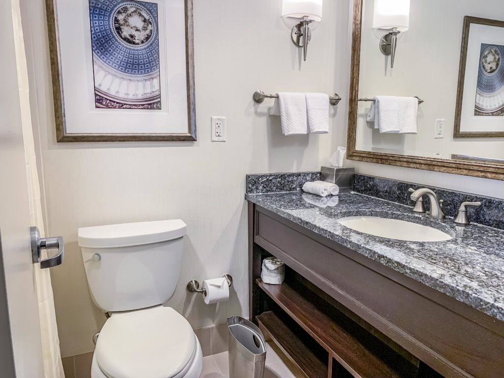 The bathroom was a bit more up-to-date with its marble countertop and large mirror. There were plenty of toiletries for my stay at the Capital Hilton DC.
